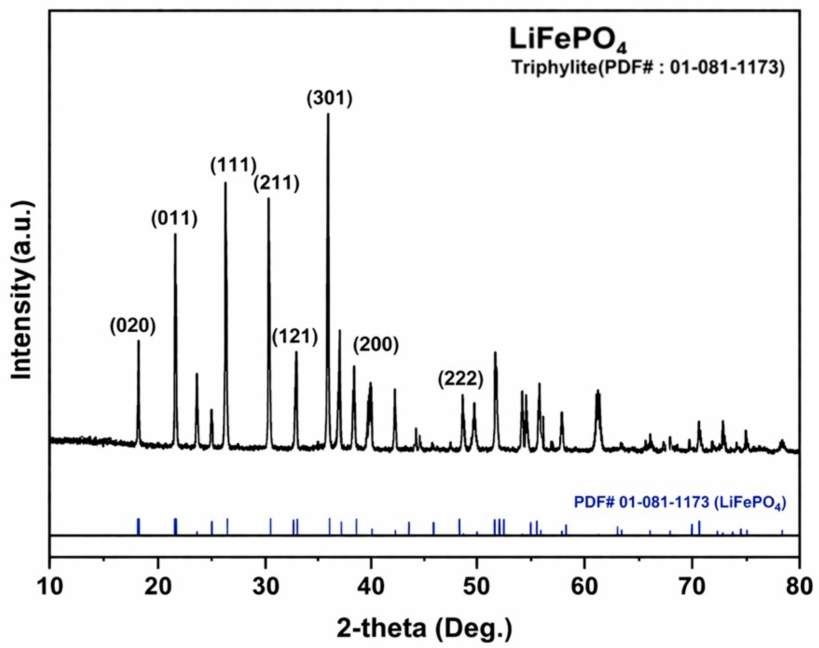 X-ray diffraction (XRD) pattern of the as-received LiFePO4 (LFP) powder (reference: triphylite, PDF #01-081-1173).