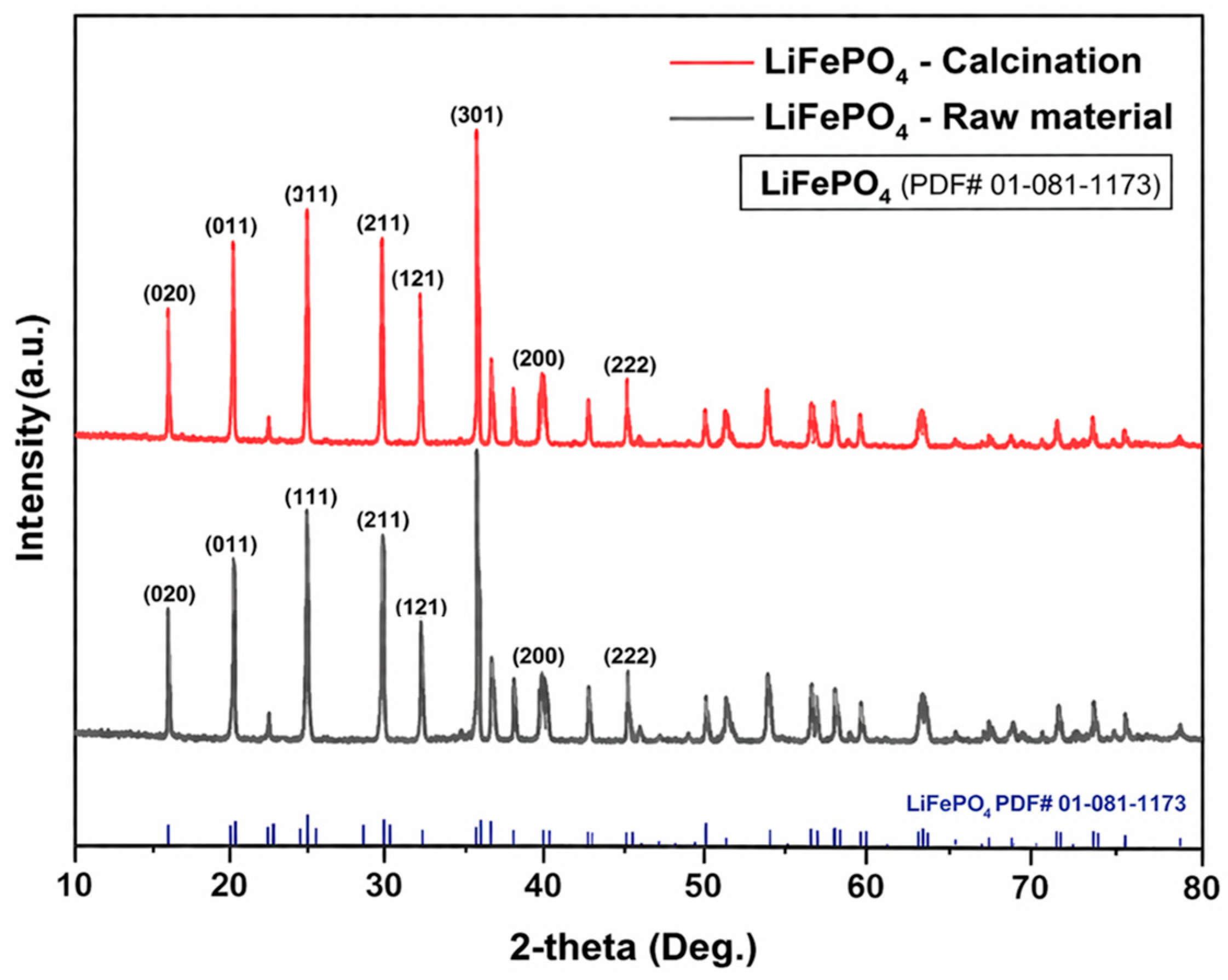 Comparison of XRD patterns between raw LiFePO4 powder and calcined LiFePO4 powder.