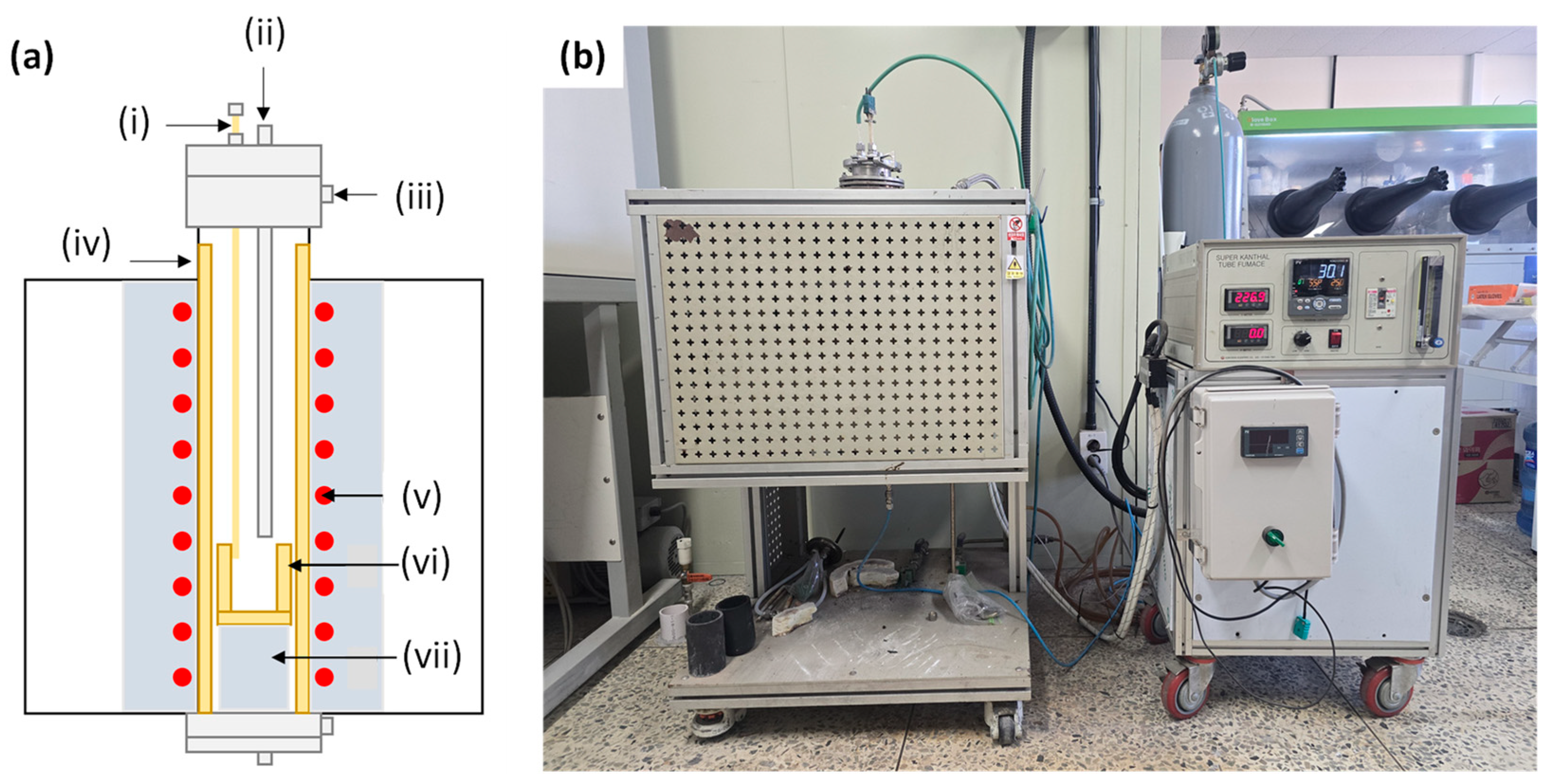 Vertical tube furnace used for CaCl2-assisted chlorination roasting: (a) schematic diagram of the vertical tube furnace; (b) photograph of the experimental setup. The main components are: (i) thermocouple, (ii) gas line, (iii) water-cooling line, (iv) alumina tube, (v) Kanthal heater, (vi) protection crucible, and (vii) alumina refractories.