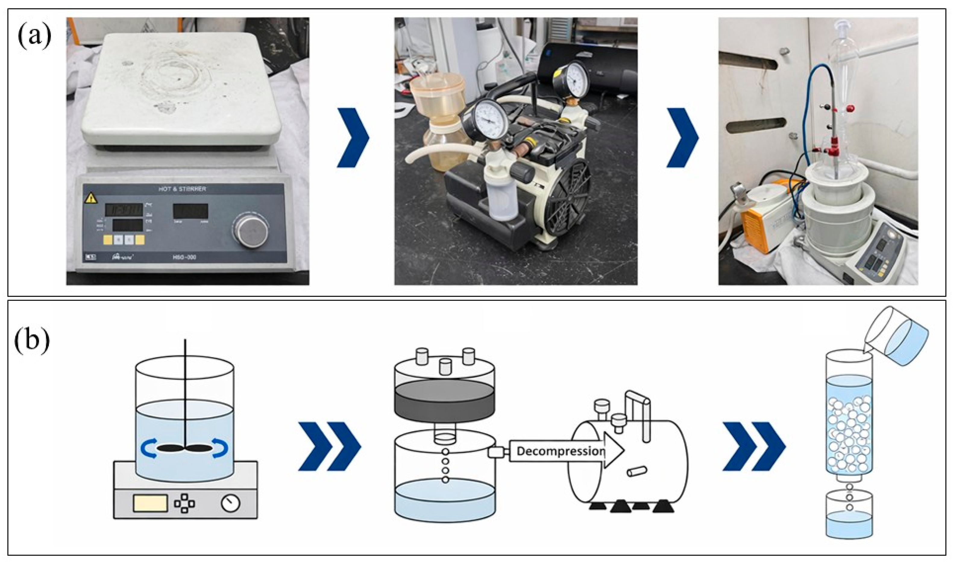 Water-leaching and purification setup for LiCl recovery: (a) photographs of the magnetic stirrer/hotplate, vacuum filtration unit with vacuum pump, and resin-based Ca2+ removal setup; (b) schematic illustration of the overall sequence (water leaching → vacuum filtration → Ca2+ removal using a cation-exchange resin). Arrows indicate the process flow direction, and the white circles represent resin beads in the cation-exchange column.