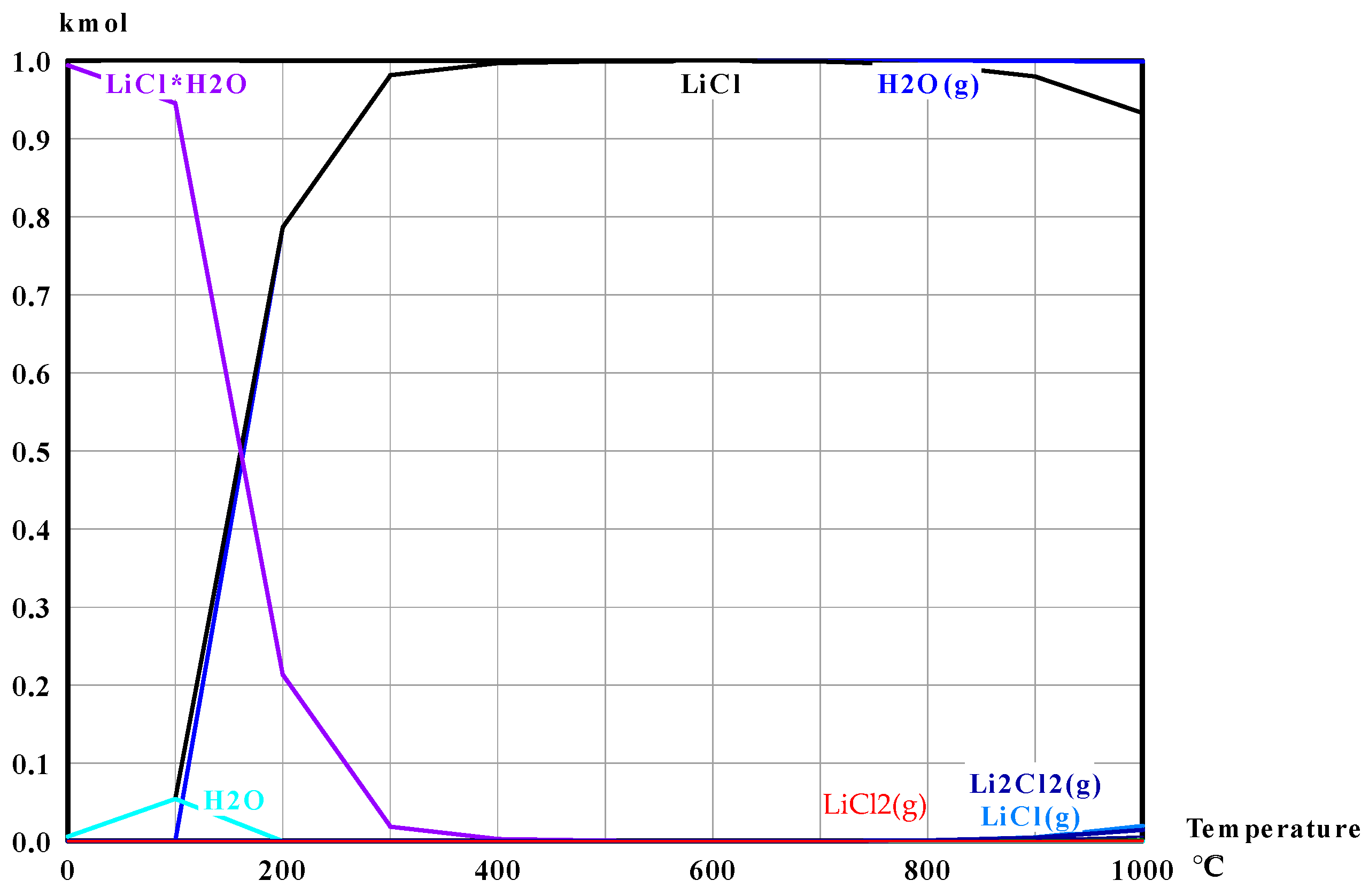 Calculated equilibrium composition for LiCl·H2O thermal decomposition at 200–800 °C (unit: mol).