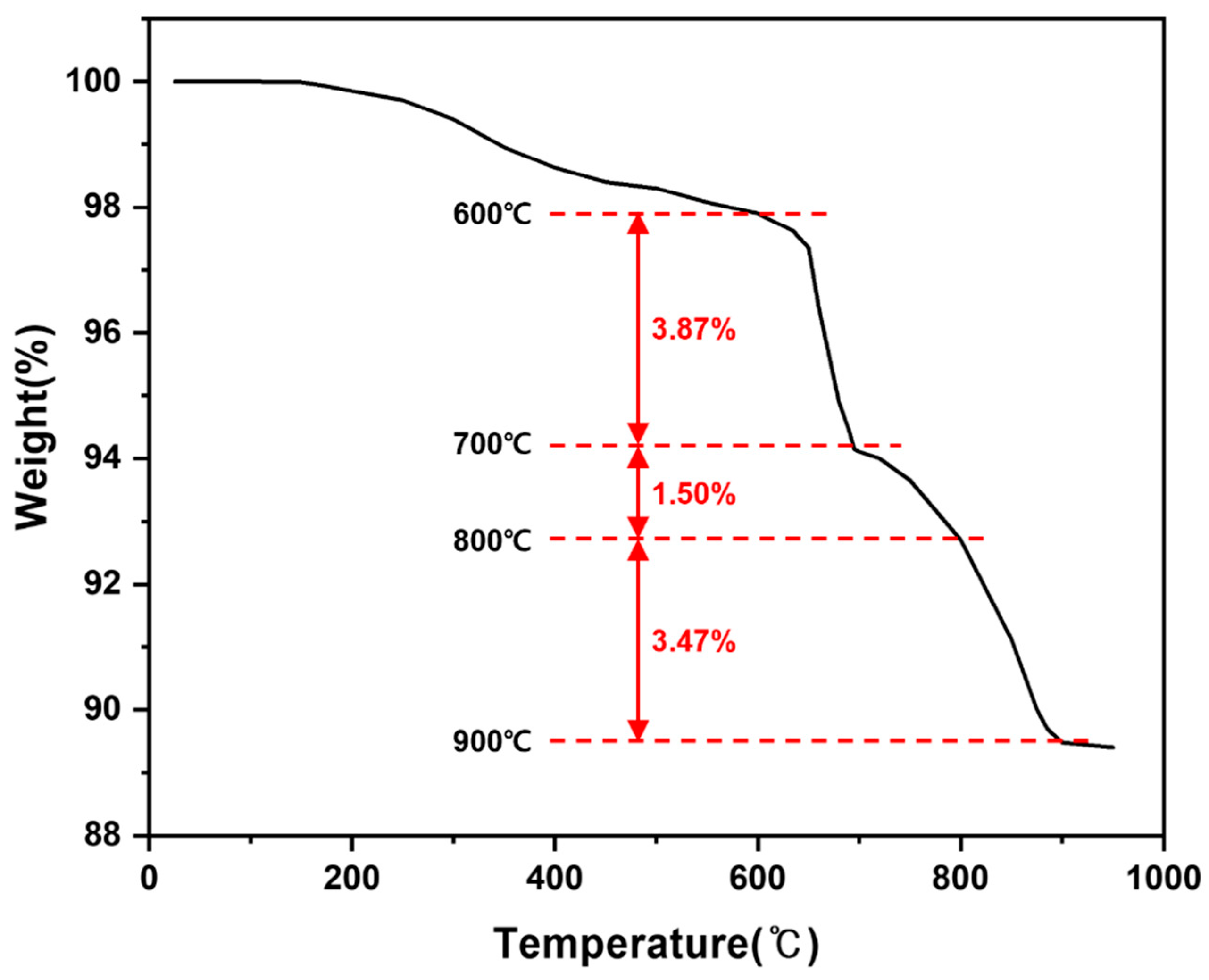 Thermogravimetric response of LiFePO4 under H2 atmosphere during stepwise heating (100–950 °C; 50 °C increments; 30 min hold at each step; 5 °C min−1), indicating a pronounced mass loss region between 600 and 900 °C.