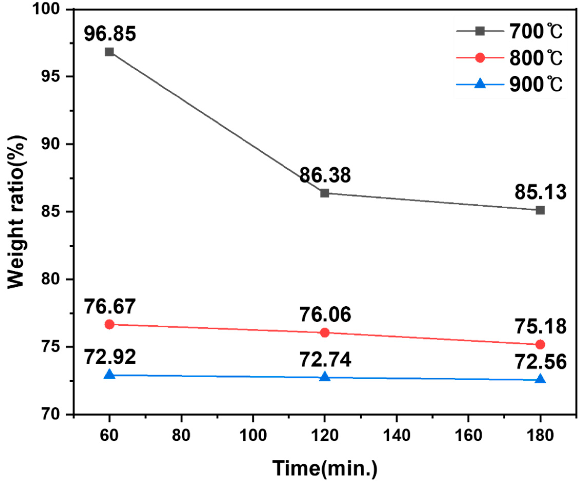 Mass-retention ratio of hydrogen-reduced products as a function of reaction time at 700–900 °C.