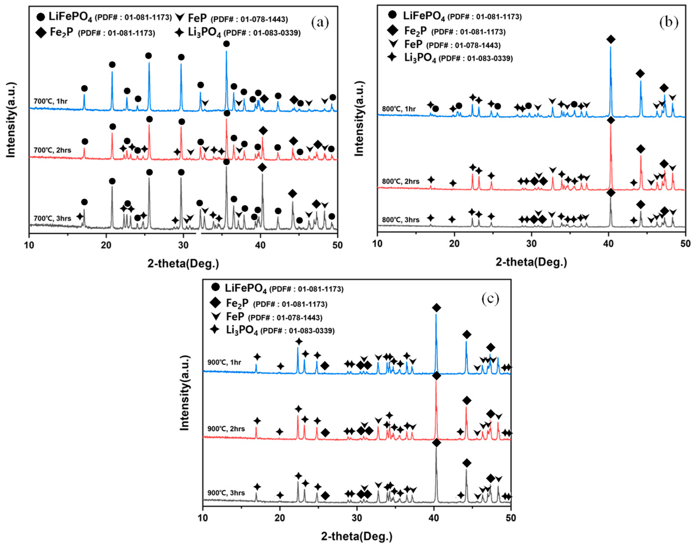 XRD patterns of hydrogen-reduction products obtained at (a) 700 °C, (b) 800 °C, and (c) 900 °C for 1–3 h, showing the progressive disappearance of LiFePO4 peaks and the formation of Li3PO4 and iron phosphides (FeP/Fe2P).