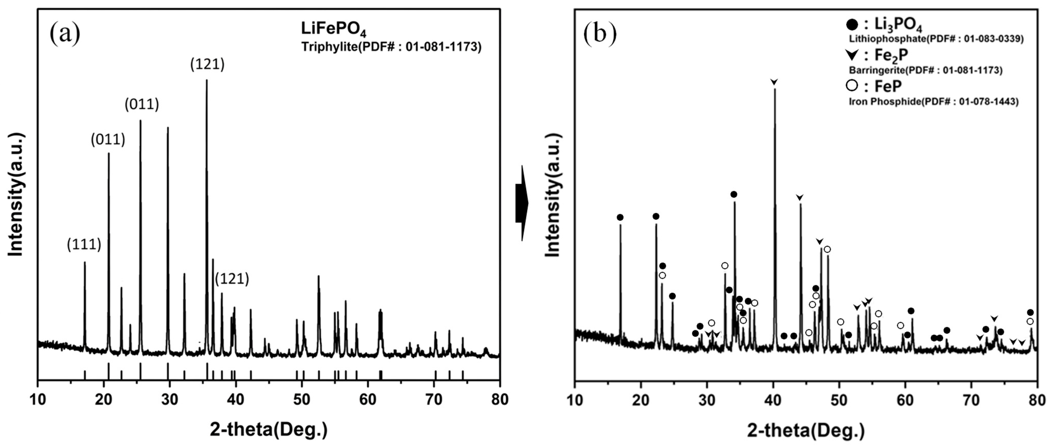 Phase evolution of LiFePO4 through hydrogen reduction, illustrated by XRD patterns of the raw material (a) and the reduced product (b) obtained under the selected condition (900 °C, 1 h), confirming the formation of Li3PO4 and iron phosphides (FeP/Fe2P).