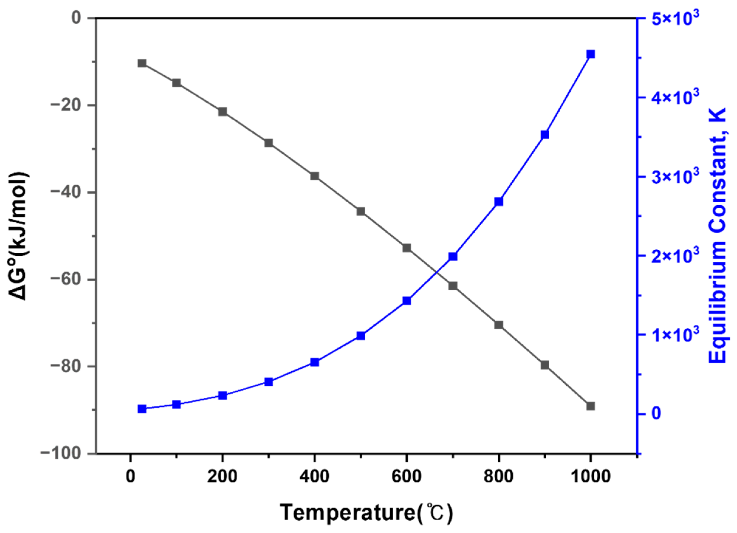 Temperature dependence of the standard Gibbs free energy change (ΔG°) and equilibrium constant (K) for the chlorination roasting reaction.