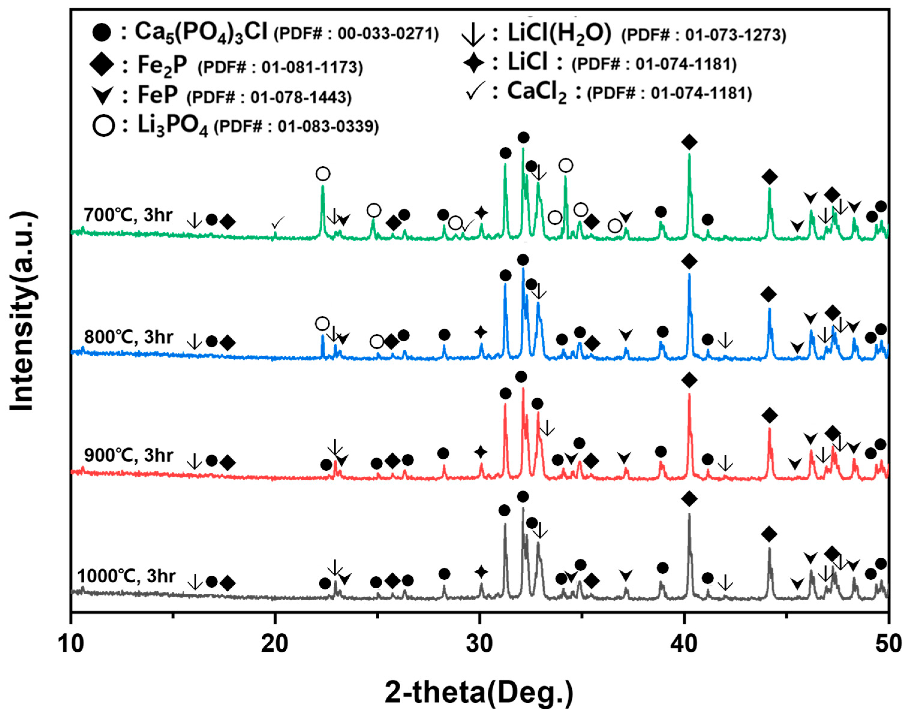 XRD patterns of chlorination-roasted products obtained at 700–1000 °C for 3 h. Major phases include LiCl, chlorapatite (Ca5(PO4)3Cl), FeP, and Fe2P; residual CaCl2 and/or phosphate-related phases may remain at lower temperatures (e.g., 700 °C) due to incomplete melting/reaction of CaCl2.