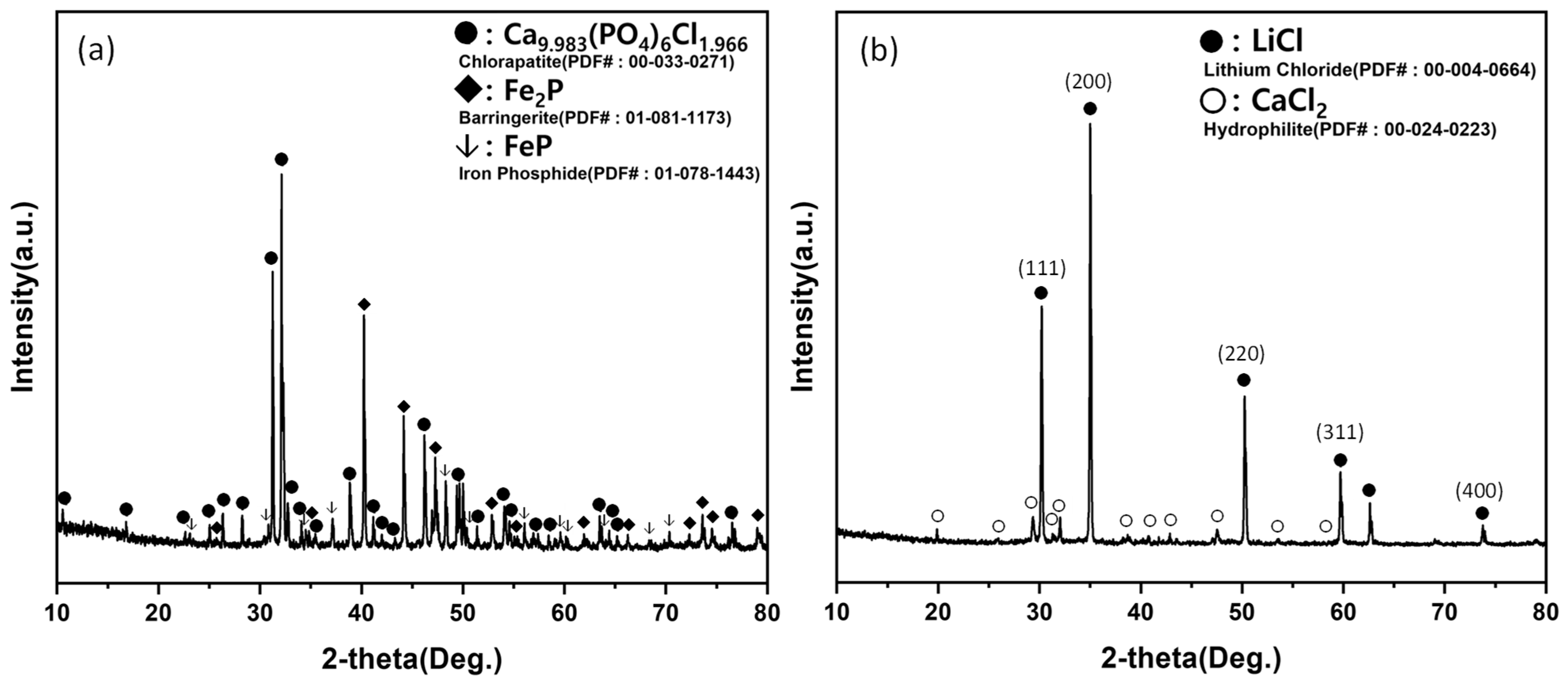 | This work | H2 reduction → Li3PO4 + FeP/Fe2P (phase separation) → CaCl2 chlorination → water leaching/vacuum filtration → Ca2+ ion exchange → drying/dehydration | LiCl (powder) | Ca2+ removed by strong-acid cation exchange (H-form) | 71.70% | Addresses Ca impurity in LiCl stream; discusses chlorapatite formation and LiCl retention mechanisms |
