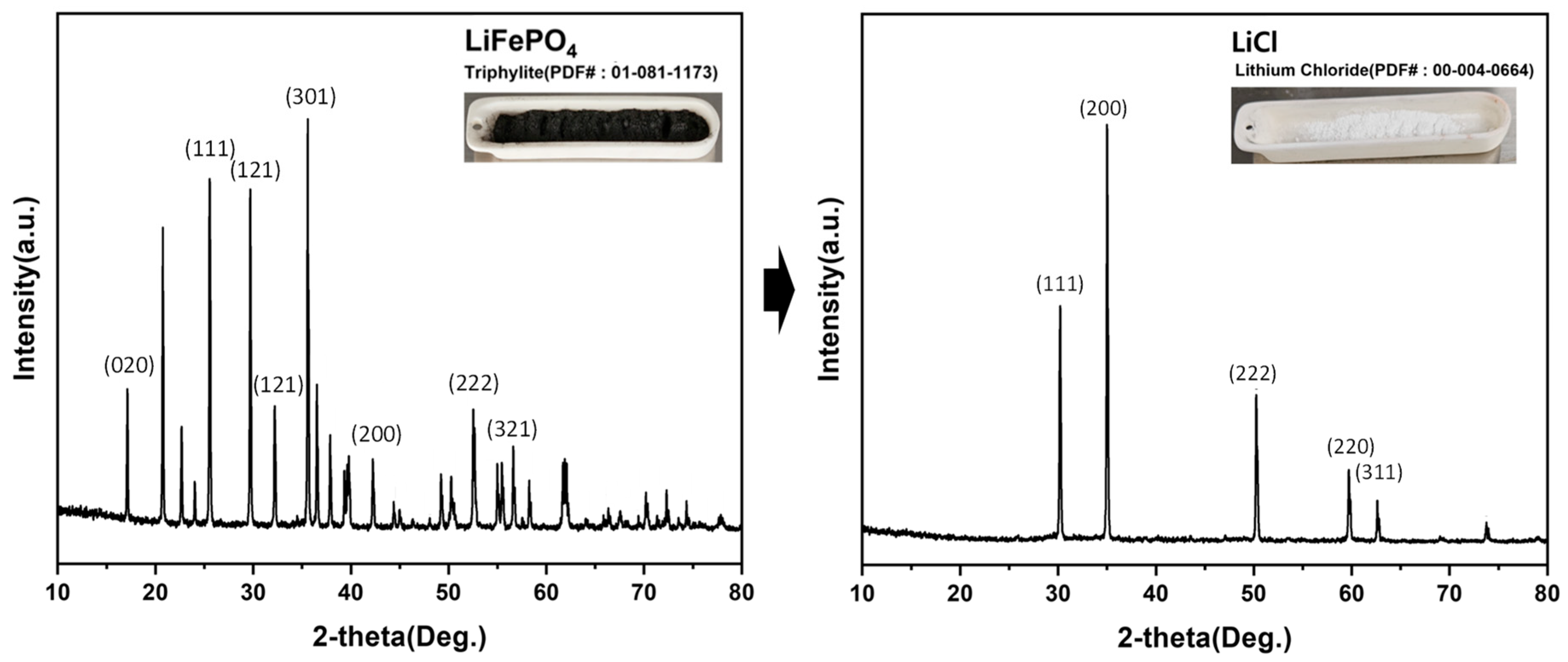 XRD patterns of the initial LiFePO4 powder and the recovered LiCl powder, confirming phase transformation and LiCl formation.