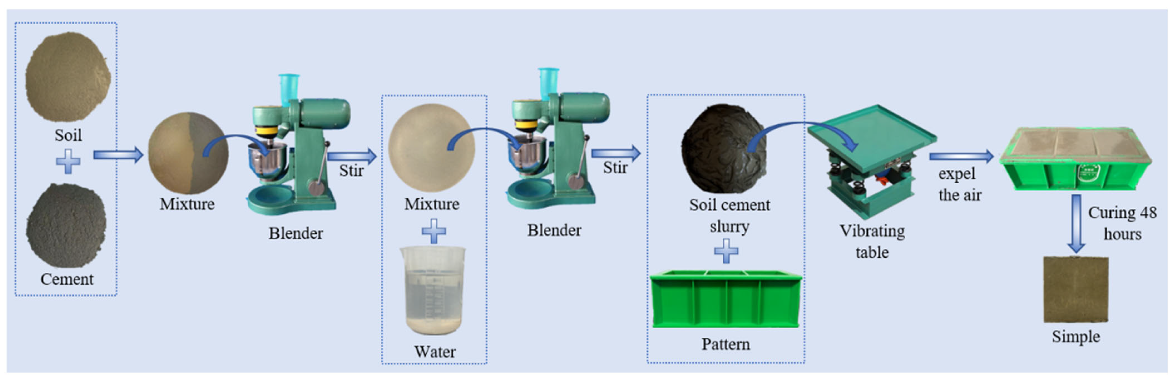 Specimen preparation and curing were conducted in accordance with the Specification for Mix Proportion Design of Cement Soil (JGJ/T 233–2011 [42]), as detailed below: