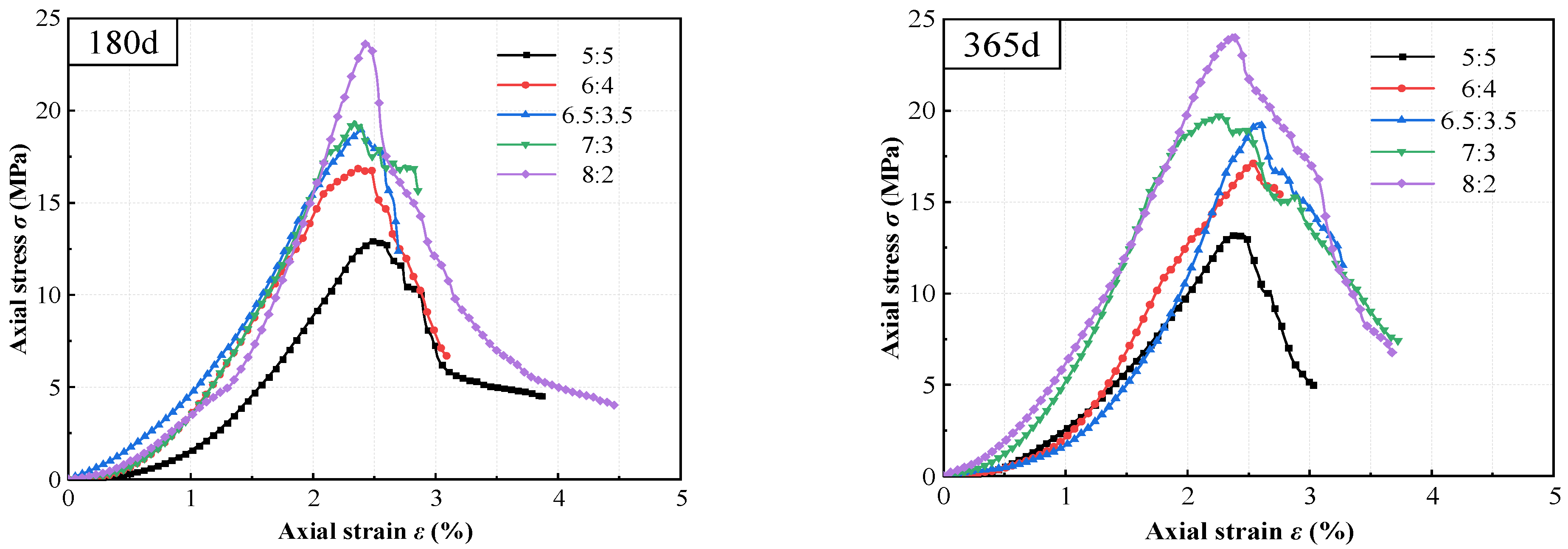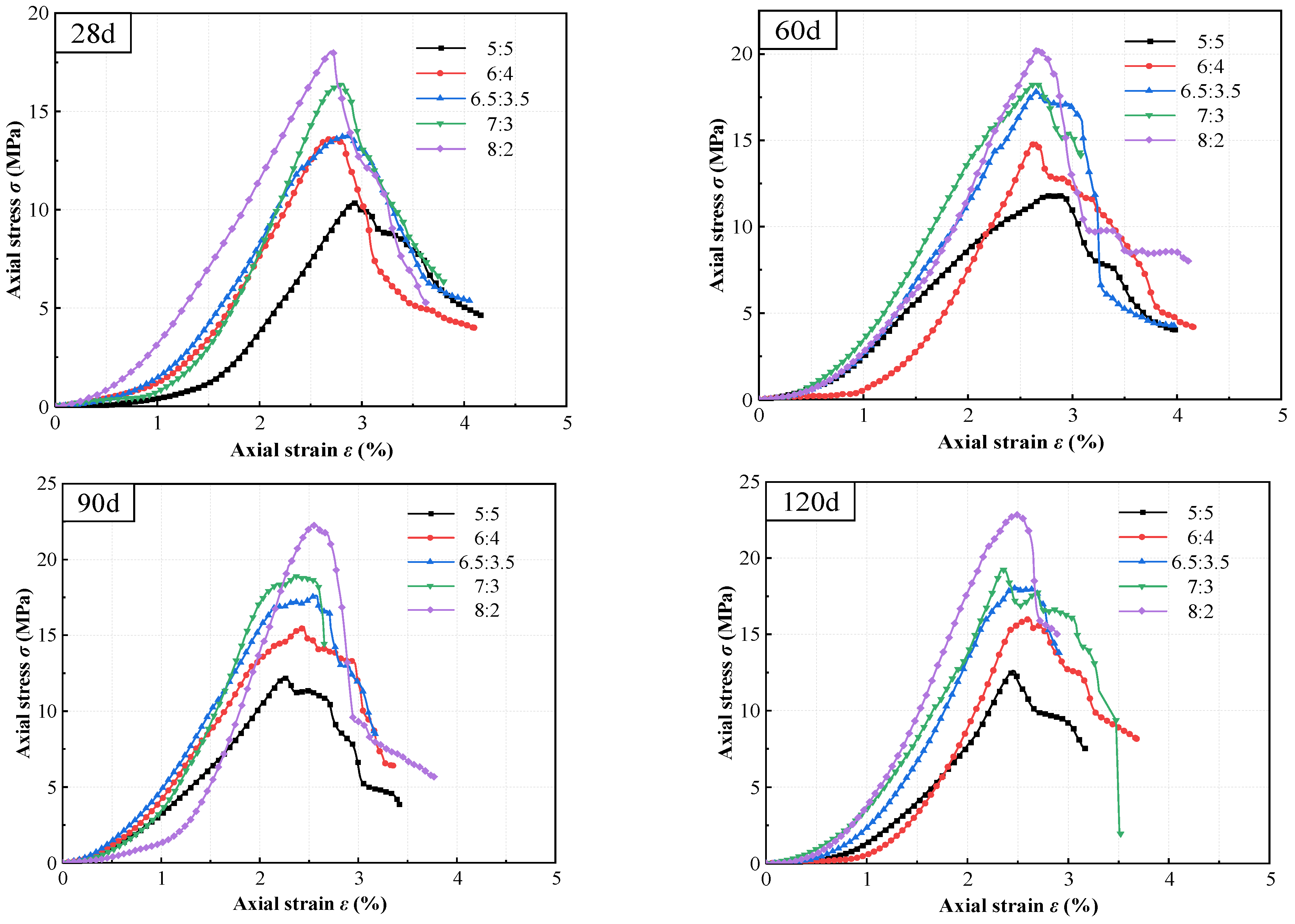 To establish a reliable baseline for evaluating subsequent seawater degradation, the stress–strain behavior of high-content cemented soil under standard freshwater curing was first characterized. As illustrated in Figure 3, which details the responses under varying cement contents and progressive curing ages, the curves exhibited conventional compaction, linear hardening, and post-peak softening stages. Notably, increasing either the cement content (e.g., from VC:VS = 5:5 to 8:2) or the curing age consistently enhanced the initial stiffness while reducing the peak strain (εp). For instance, with cement content increased to VC:VS = 8:2 and curing age extended to 365 days, the linear-hardening slope (initial stiffness) increased, whereas εp decreased from 2.70% to 2.37%. This macroscopic response signifies a fundamental transition from a low-strength, ductile response to a high-strength, brittle failure mechanism under standard conditions.