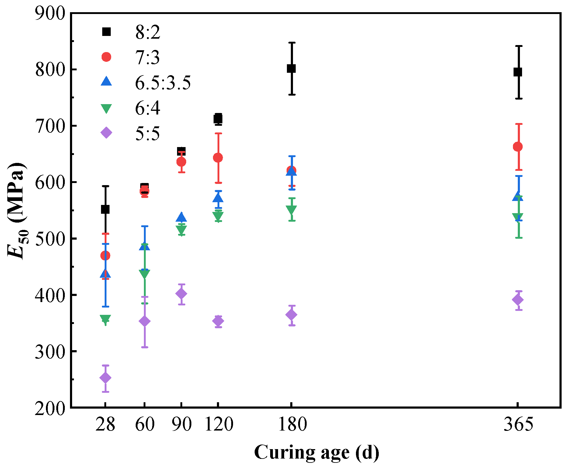 To quantitatively evaluate this embrittlement behavior, the deformation modulus (E50), defined as the secant modulus at 50% of the peak unconfined compressive strength, was systematically extracted. As illustrated in Figure 4, E50 exhibits a consistent upward trend with both curing age and cement content. For instance, at the early age of 28 days, increasing the binder ratio from 5:5 to 8:2 resulted in a substantial surge in E50 from 252.9 MPa to 551.5 MPa. This rigidification becomes even more pronounced at long-term ages (365 days), where the E50 of the 8:2 group reaches nearly 800 MPa, completely doubling that of the 5:5 baseline (391.3 MPa). In the mechanics of cemented soils, such a dramatic multi-fold surge in stiffness (E50), coupled with the previously noted strict reduction in peak failure strain, serves as a classic quantitative indicator of material embrittlement. This explicitly confirms that higher cement contents drive the macroscopic failure mode from ductile to highly brittle.