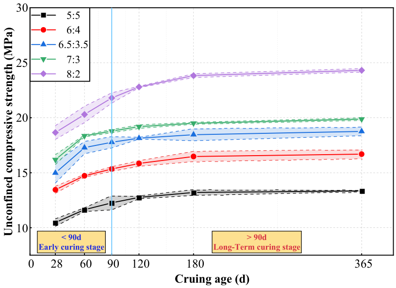 Figure 5 and Figure 6 present the unconfined compressive strength (UCS) evolution. Irrespective of the mix proportion, strength evolution exhibited a distinct biphasic pattern: a rapid early-stage gain (<90 days, driven by vigorous hydration) followed by a pronounced long-term deceleration (>90 days). By 365 days, the VC:VS = 8:2 mixture reached 24.31 MPa, representing an 82.1% increase over the VC:VS = 5:5 mix (13.35 MPa) and 45.7% increase over the VC:VS = 6:4 mix (16.69 MPa).