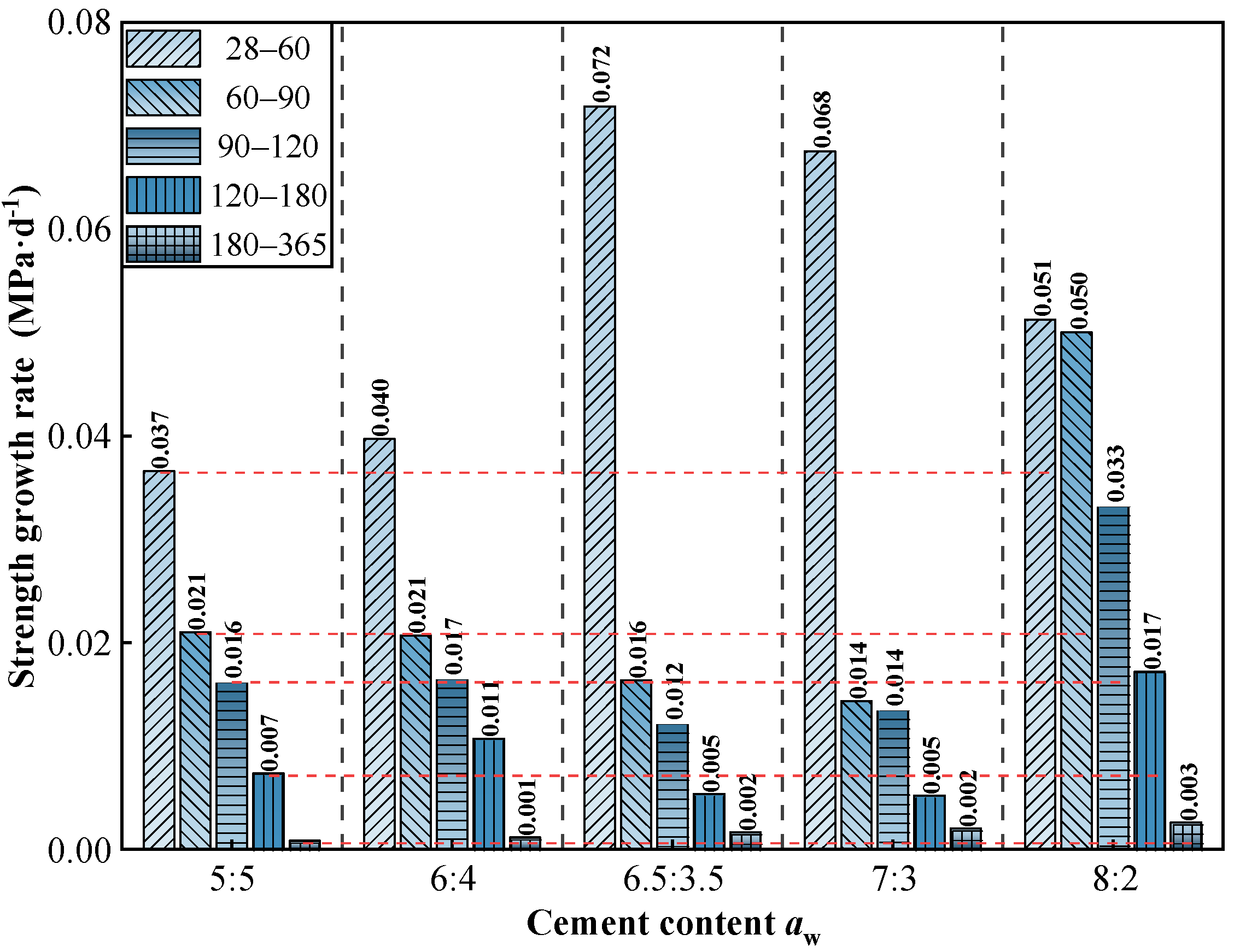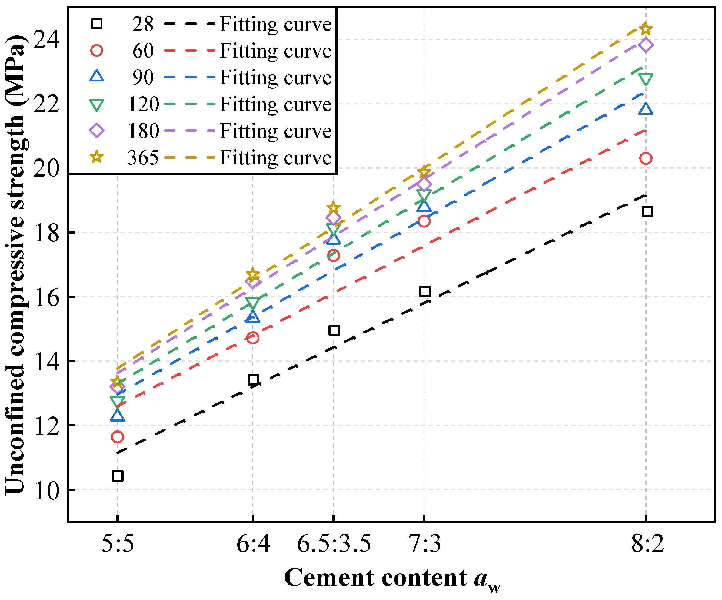 To quantify the effects of cement content and curing age on the mechanical properties and microstructure of high-content cemented soil, five cement contents and six curing ages (28, 60, 90, 120, 180, and 365 days) were investigated. Curing periods exceeding 90 days were designated as the long-term curing stage.
