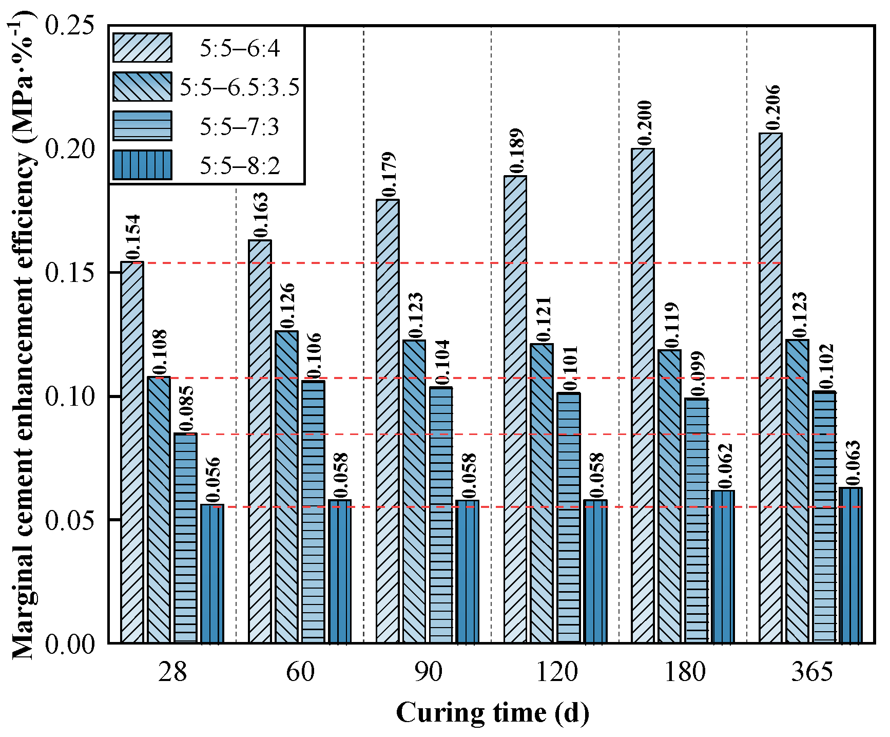 The marginal cement enhancement efficiency (ηc) is defined as the strength increment per 1% increase in cement content relative to a baseline. ηc is calculated as follows: