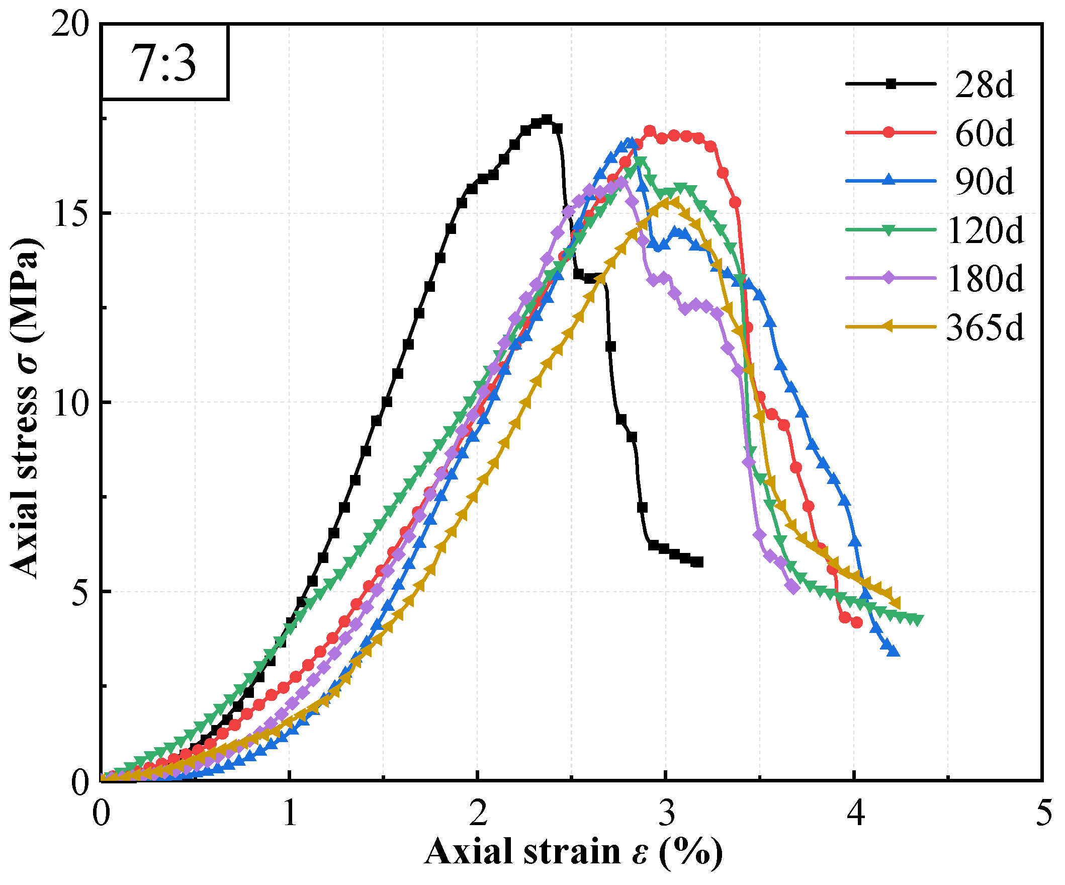 Figure 9. Stress–strain curves of high-content cemented soil with different curing ages in seawater.