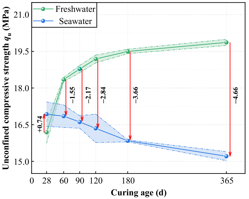 Figure 11 illustrates the variation in unconfined compressive strength (qu) of high-content cemented soil over curing age under both freshwater and seawater conditions. The results indicated that the impact of seawater exposure followed a distinct dual-stage pattern: early-stage enhancement followed by long-term deterioration.