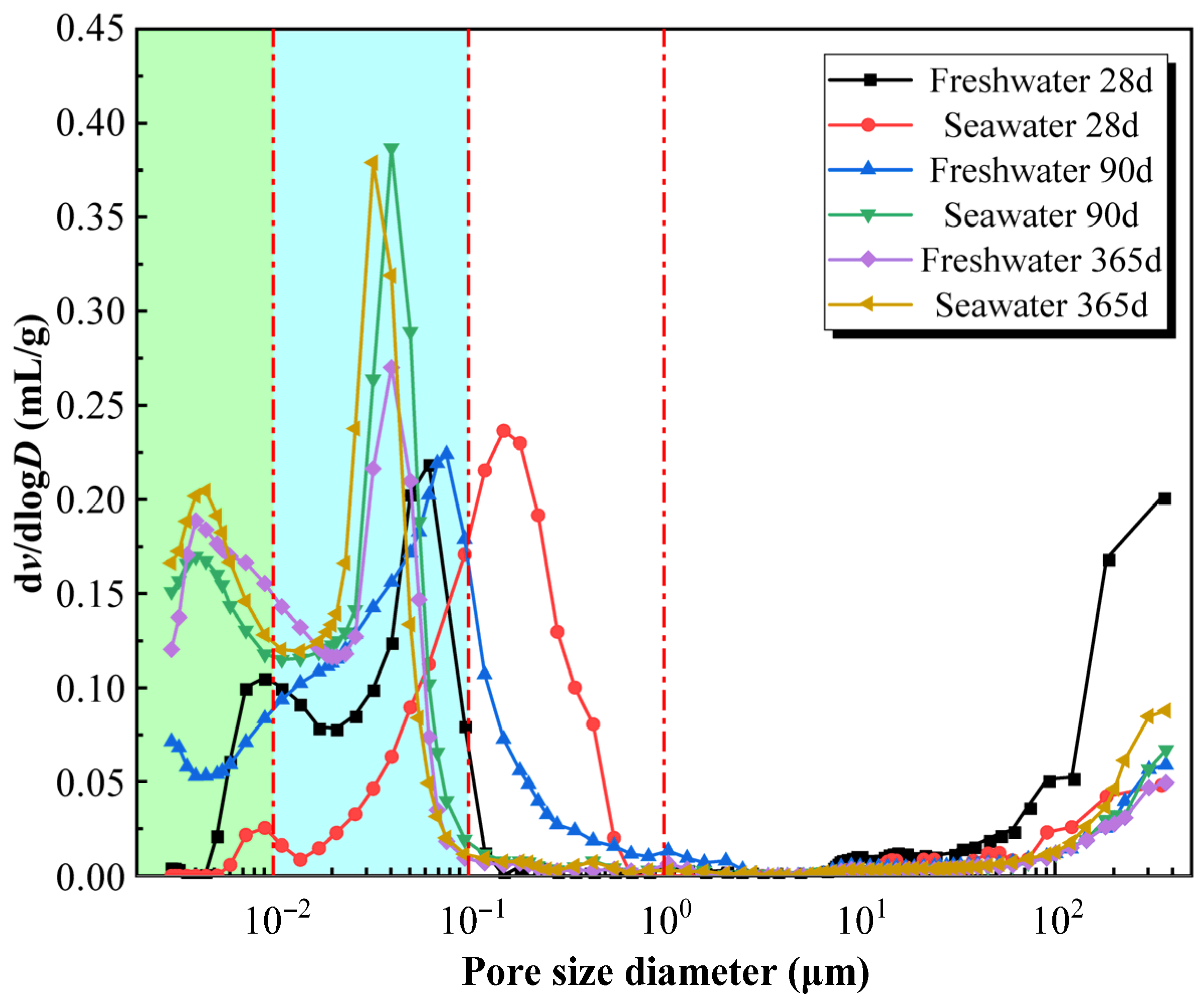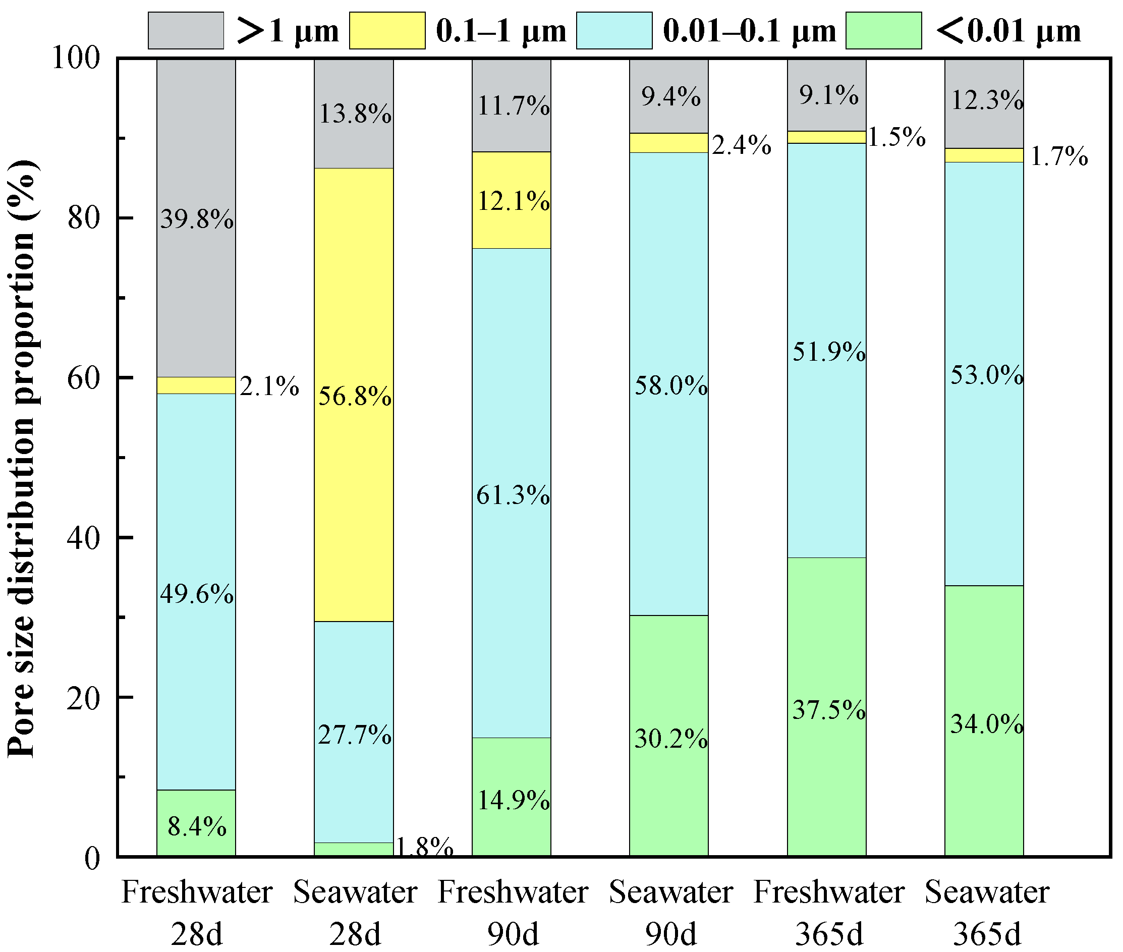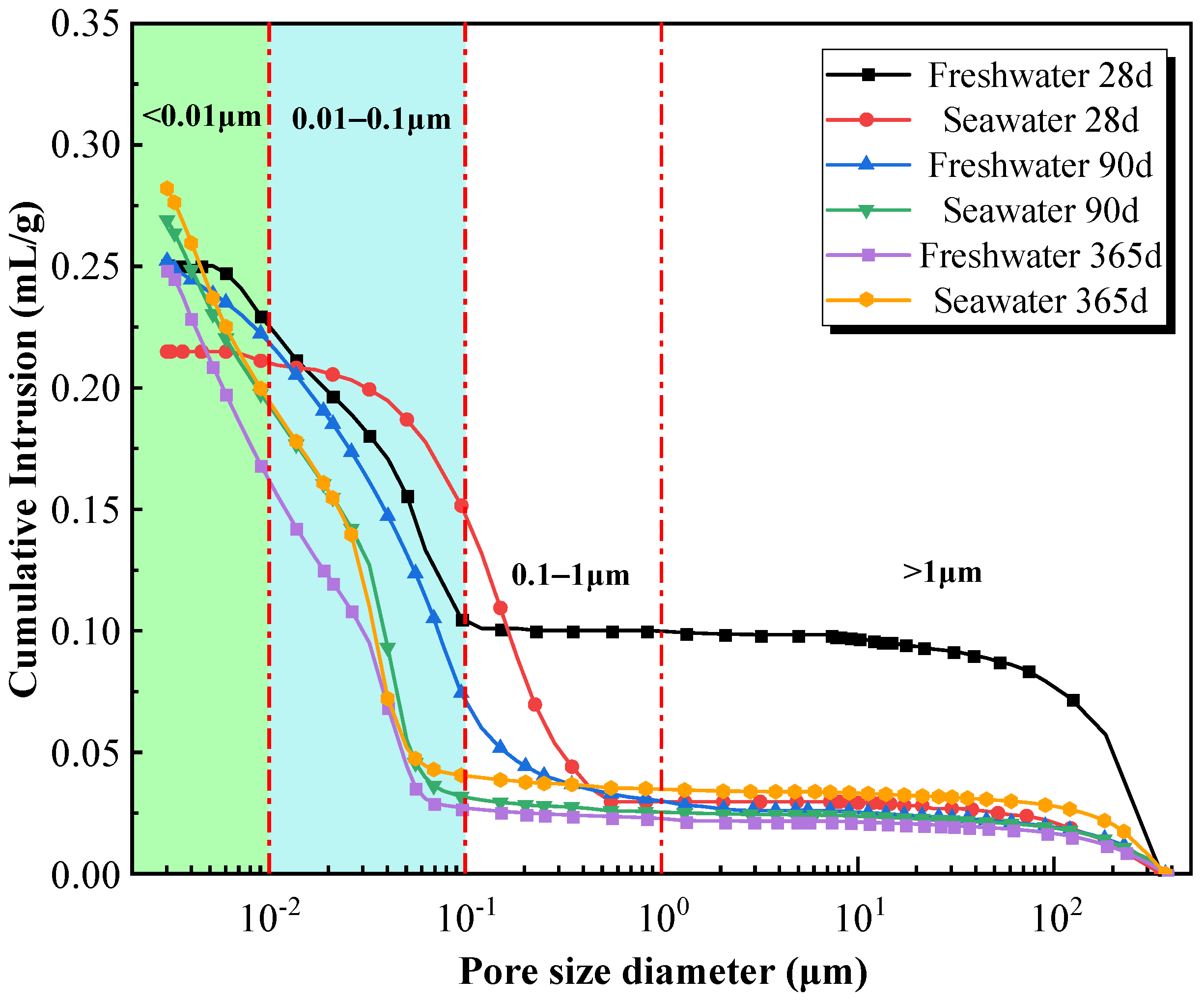 Conversely, seawater-cured specimens exhibited a distinct multiphase pore evolution: an immediate massive physical filling at 28 days, continued densification at 90 days, followed by subsequent structural deterioration at 365 days. In the initial 28-day stage, seawater exposure induced a dramatic pore-filling effect. Compared to the freshwater control (39.8% macropores), the macropore proportion in the 28-day seawater specimen sharply dropped to 13.8%, while the mesopore proportion (0.1–1 μm) spiked anomalously to 56.8%. This intense localized filling suggests that early-stage seawater-induced erosion products (e.g., ettringite and Friedel’s salt) rapidly precipitate and block larger defects, providing the microstructural basis for the macroscopic strength enhancement observed at 28 days. By 90 days, the primary steep-descent segment further shifted toward smaller diameters relative to the freshwater counterpart; the micropore proportion reached 30.2% (nearly double that of the freshwater group), while the mesopore proportion was reduced to 2.4%. Strikingly, as shown in Figure 16, the total cumulative volumes for the Seawater-365d and Freshwater-365d specimens are nearly identical. This demonstrates that seawater exposure does not necessarily increase overall porosity; rather, it fundamentally alters the nature of the solid skeleton.