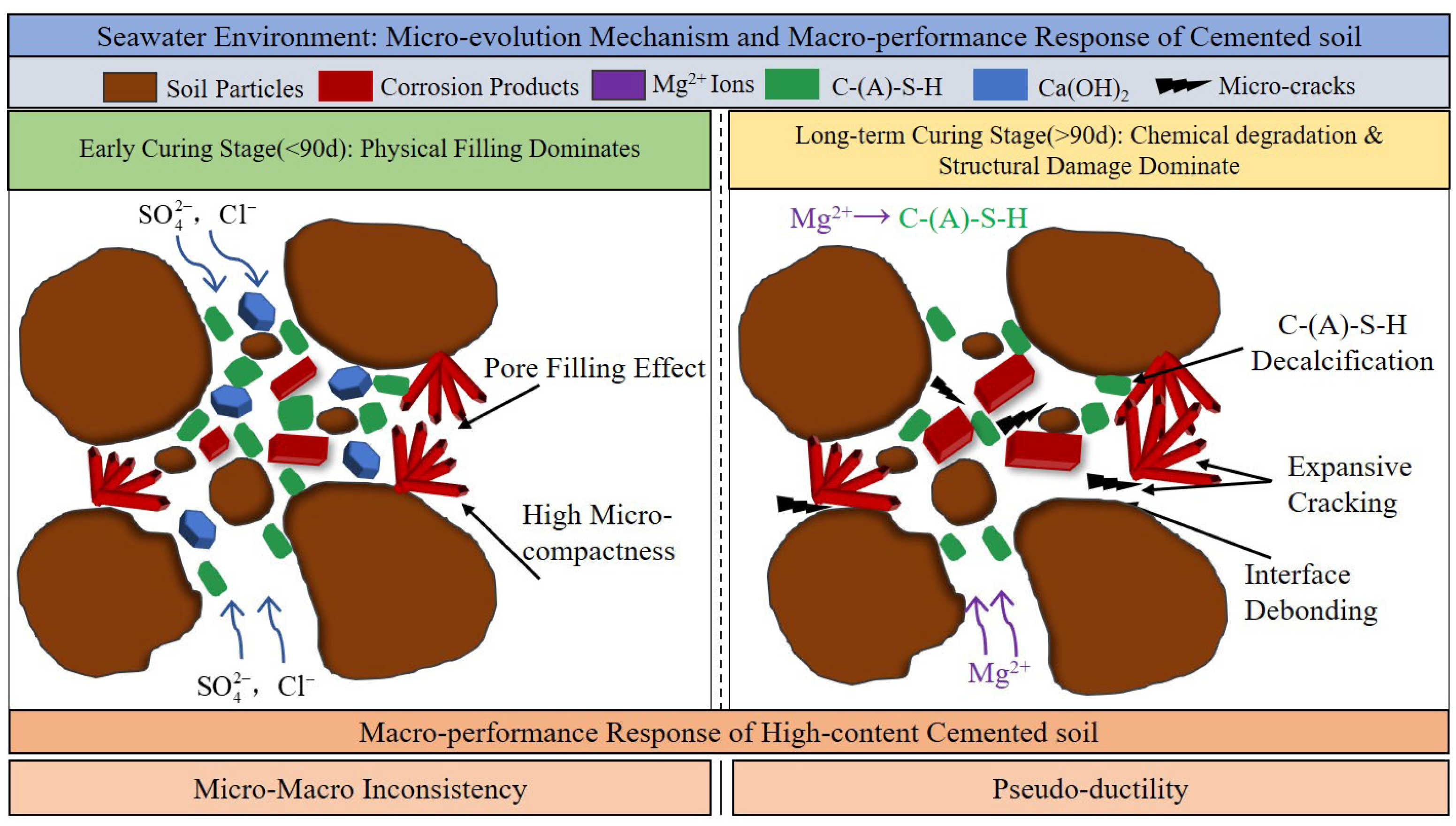 Despite the widespread application of high-content cemented soils in deep foundations, their long-term durability design remains largely empirical. Current engineering paradigms often extrapolate the classic “porosity-strength synergy”—established for conventional systems—to these cement-rich matrices. This implicitly assumes that a denser initial microstructure and a massive alkaline reserve inherently guarantee superior long-term erosion resistance. However, this direct extrapolation is fundamentally problematic. Existing research predominantly focuses on the macroscopic strength deterioration of conventional soil–cement or the expansive cracking of rigid marine concrete, leaving a critical knowledge gap regarding the complex chemo-mechanical coupling in high-content systems. Specifically, it remains largely unknown how the extreme initial compactness and robust alkaline buffer interact with the continuous ingress of marine ions over prolonged exposure (e.g., up to 365 days). Consequently, the long-term deterioration kinetics of high-content cemented soils remain theoretically ambiguous, making it unclear whether early-stage physical pore-filling by erosion products temporarily conceals the underlying chemical degradation of the cementing phases.