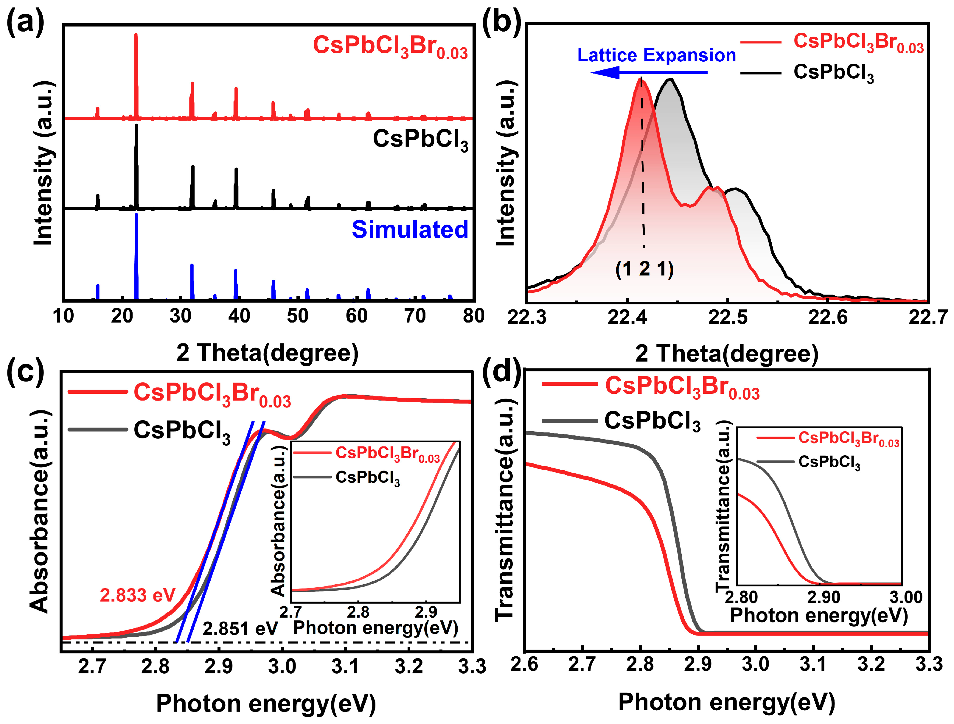 - Huang, X.; Cheng, B.; Ma, W.; Qi, S.; Zhang, Y.; Shen, M.; Bo, T.; Zhang, L.; Lin, W. CsPbBrxCl3–x Solid Solutions: Understanding the Relationship between Lattice Expansion and Optical Properties. Inorg. Chem. 2024, 63, 11924–11929. [Google Scholar] [CrossRef] [PubMed]