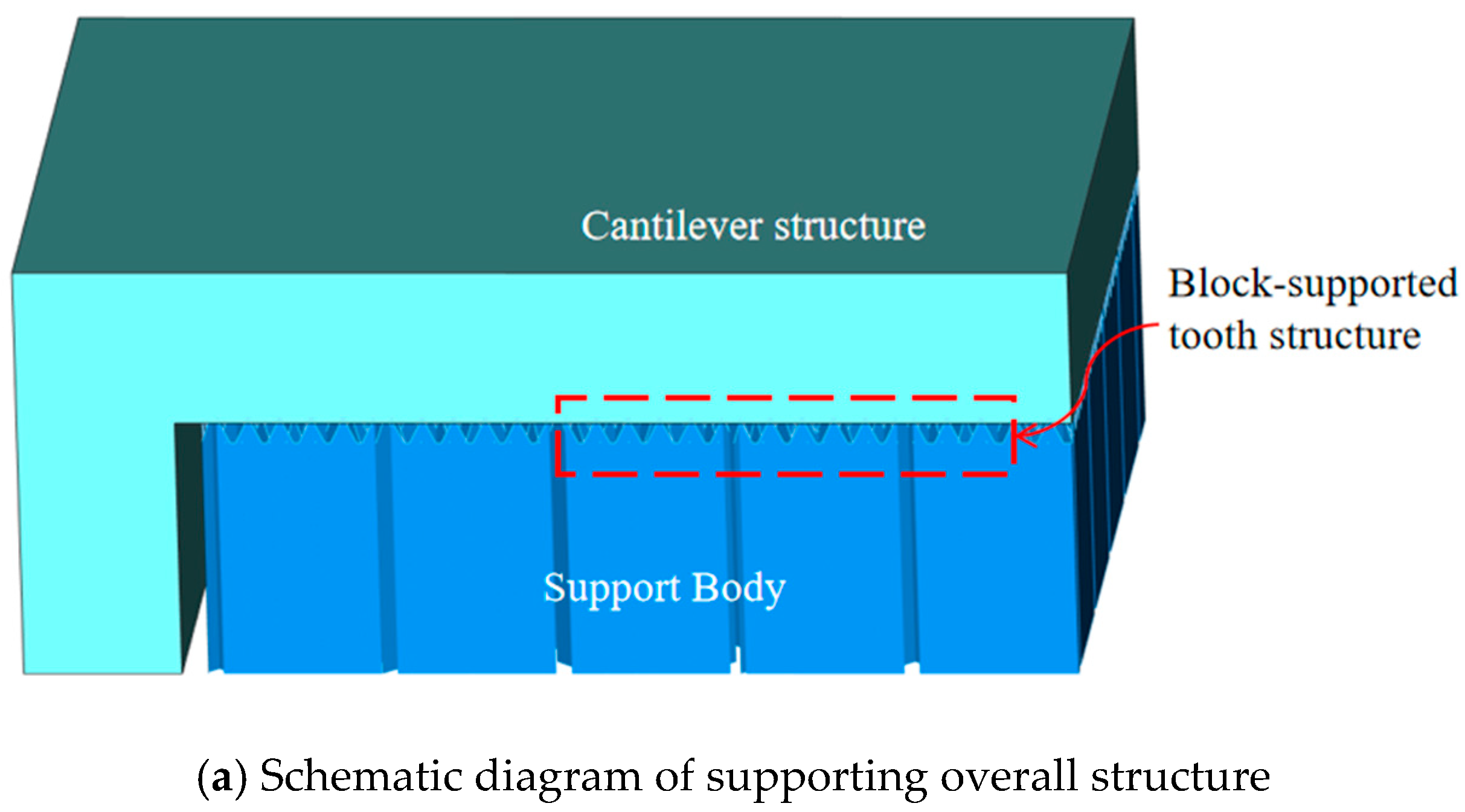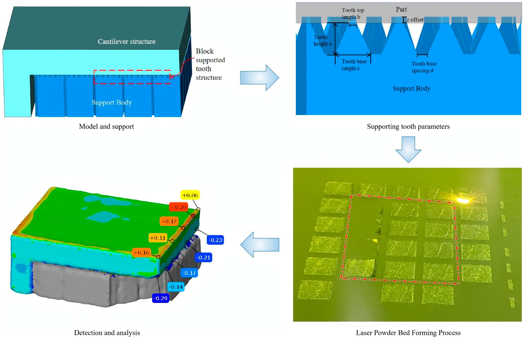 The findings of this study demonstrate that the optimized block-shaped support tooth parameters can be effectively applied to the design of lower surface support teeth for single cantilever structures fabricated from the same material. Furthermore, these results offer essential experimental data support and a valuable reference for the design of support tooth parameters for similar cantilever structural features in laser powder bed fusion.