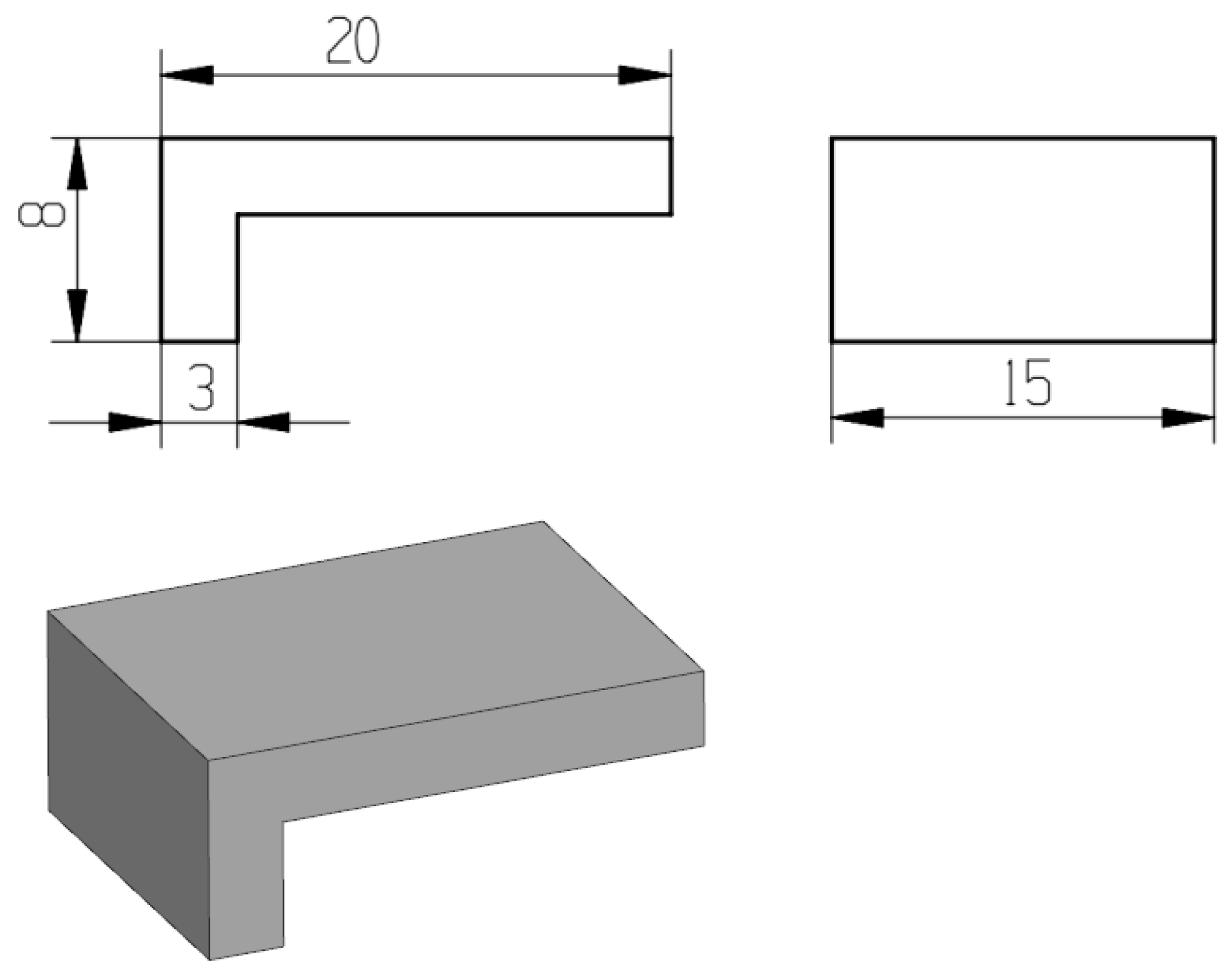 To investigate the influence mechanism of block support tooth parameters on the forming accuracy of cantilever structures, a three-dimensional model of the test specimen was first established using NX 12.0 CAD software. The cantilever specimen has dimensions of 20 mm × 15 mm × 8 mm (length × width × height), as illustrated in