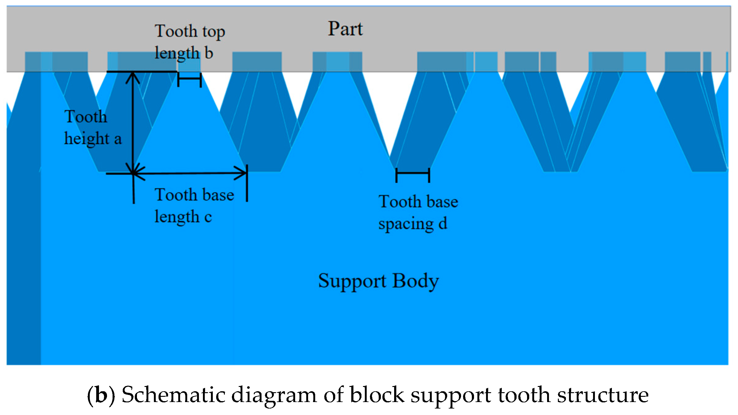 After modeling, the suspension arm test specimen was imported into Magics 24.0 software. Block supports were subsequently generated on the structurally critical overhang surfaces—areas particularly susceptible to forming defects. The key geometric parameters of the support teeth are defined as follows: tooth height (a), tooth top length (b), tooth base length (c), and tooth base spacing (d). The contact interface between the block support and the cantilever specimen, the specific values of these parameters, and the overall support layout are presented in