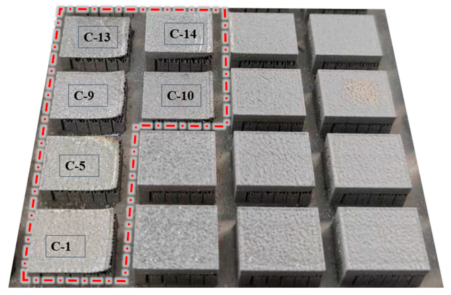Figure 4, the red box highlights the printing status of the 16 groups of samples during fabrication. In