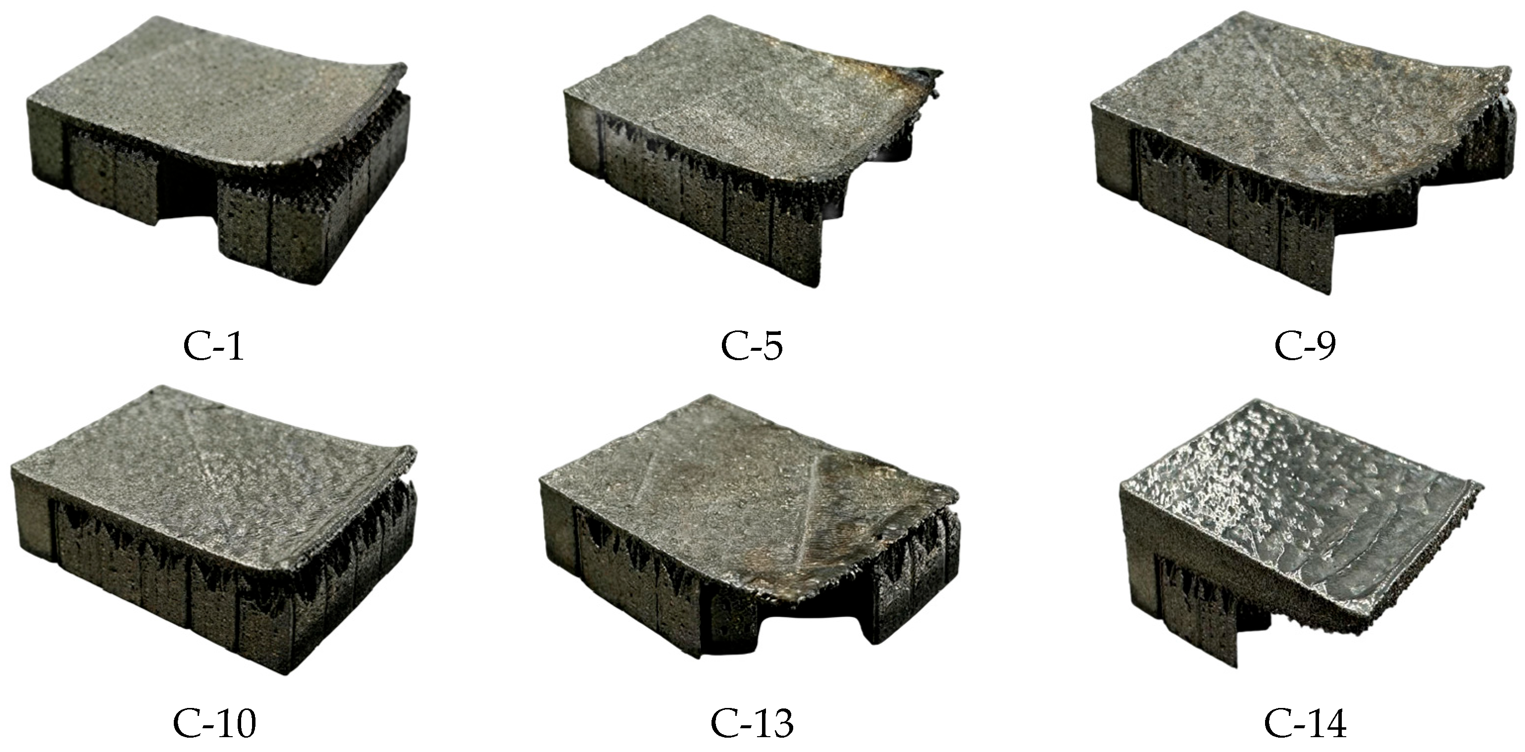 Figure 6. Among these, five specimens (Nos. C-1, C-5, C-9, C-10, and C-13) experienced severe warping deformation and were proactively terminated following comprehensive assessment; accordingly, they are categorized as “printing failure” samples. In contrast, although specimen No. C-14 also underwent significant deformation, it successfully completed the forming process.