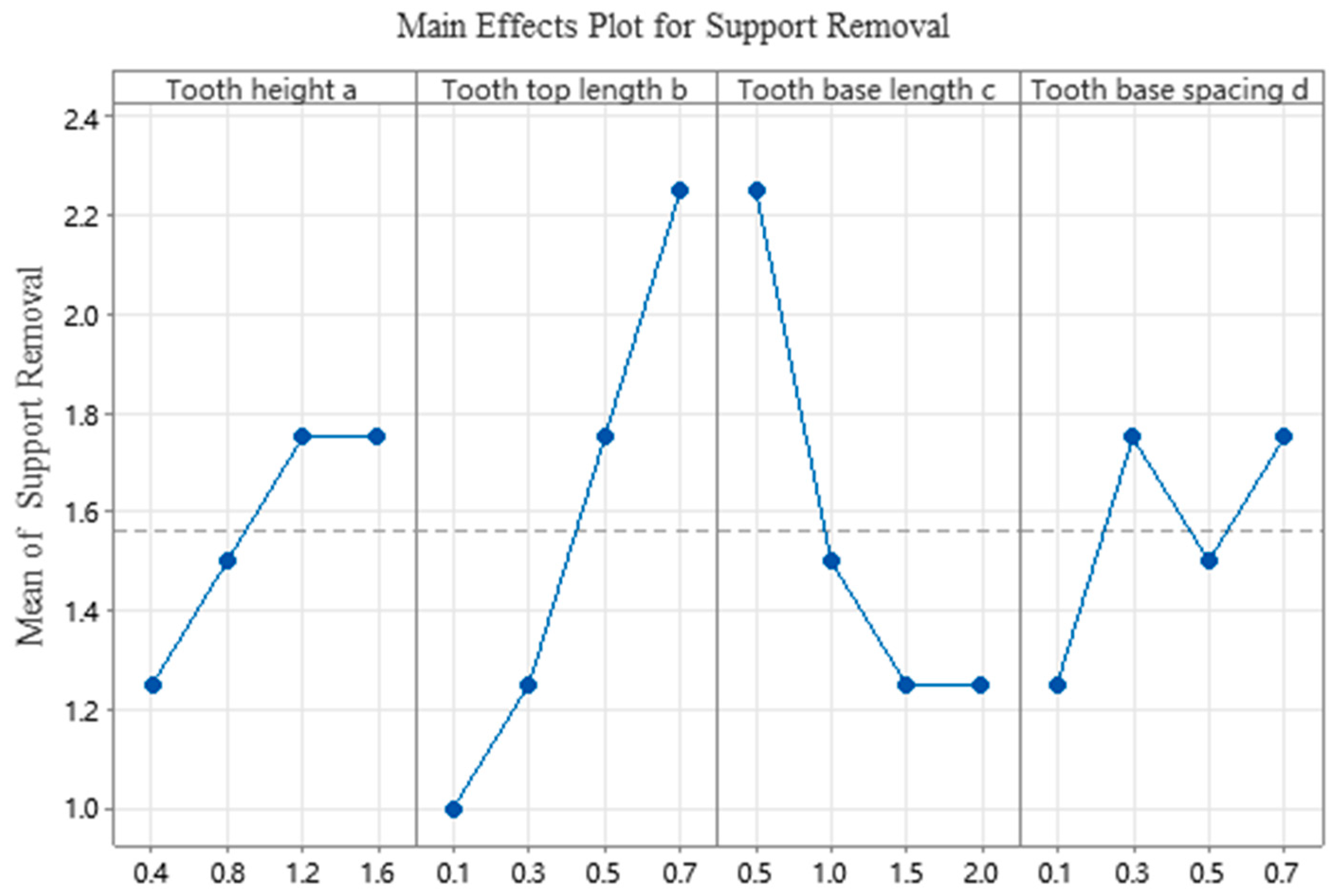 Table 10. The results show that the length b of the tooth top has the greatest impact on the difficulty of removing support, followed by the length c of the tooth base, the height a of the tooth, and the spacing d between the tooth base. It can be seen that the length b of the tooth top is the main factor affecting the difficulty of removing the support.