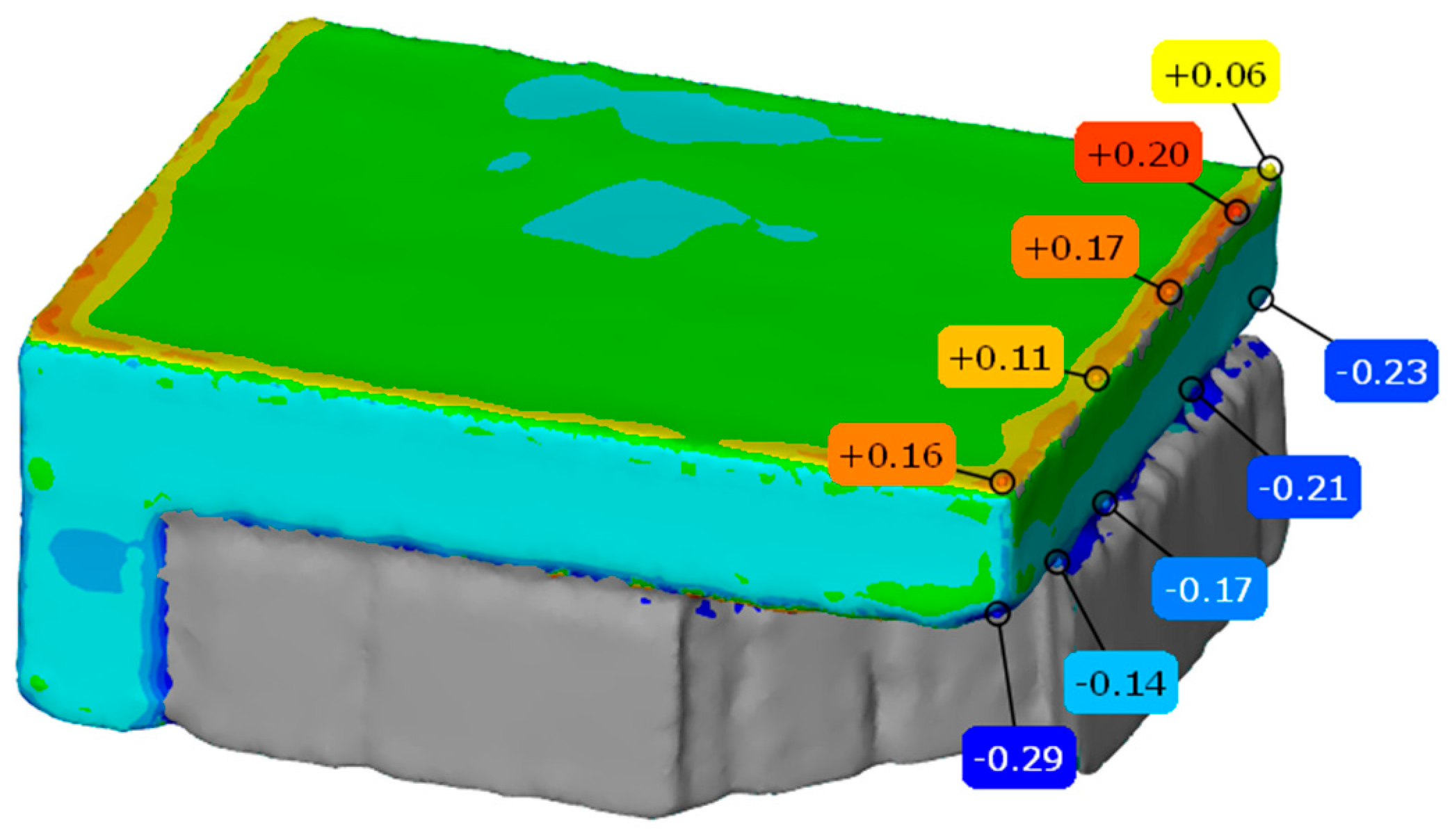 The 3D inspection results show that the upper surface of the cantilever component presents a trend of high to medium flatness at the four edges, and the overall deviation in the middle part of the upper surface is not large, ranging from −0.1 to 0.1. The maximum deviation at the four edges is +0.20 mm; the maximum deformation at the contact edge between the support and the lower surface of the cantilever is −0.29 mm; and the average deformation is −0.208 mm. Within the process window, the effectiveness of this combination parameter is verified by considering both forming accuracy and support removal difficulty.