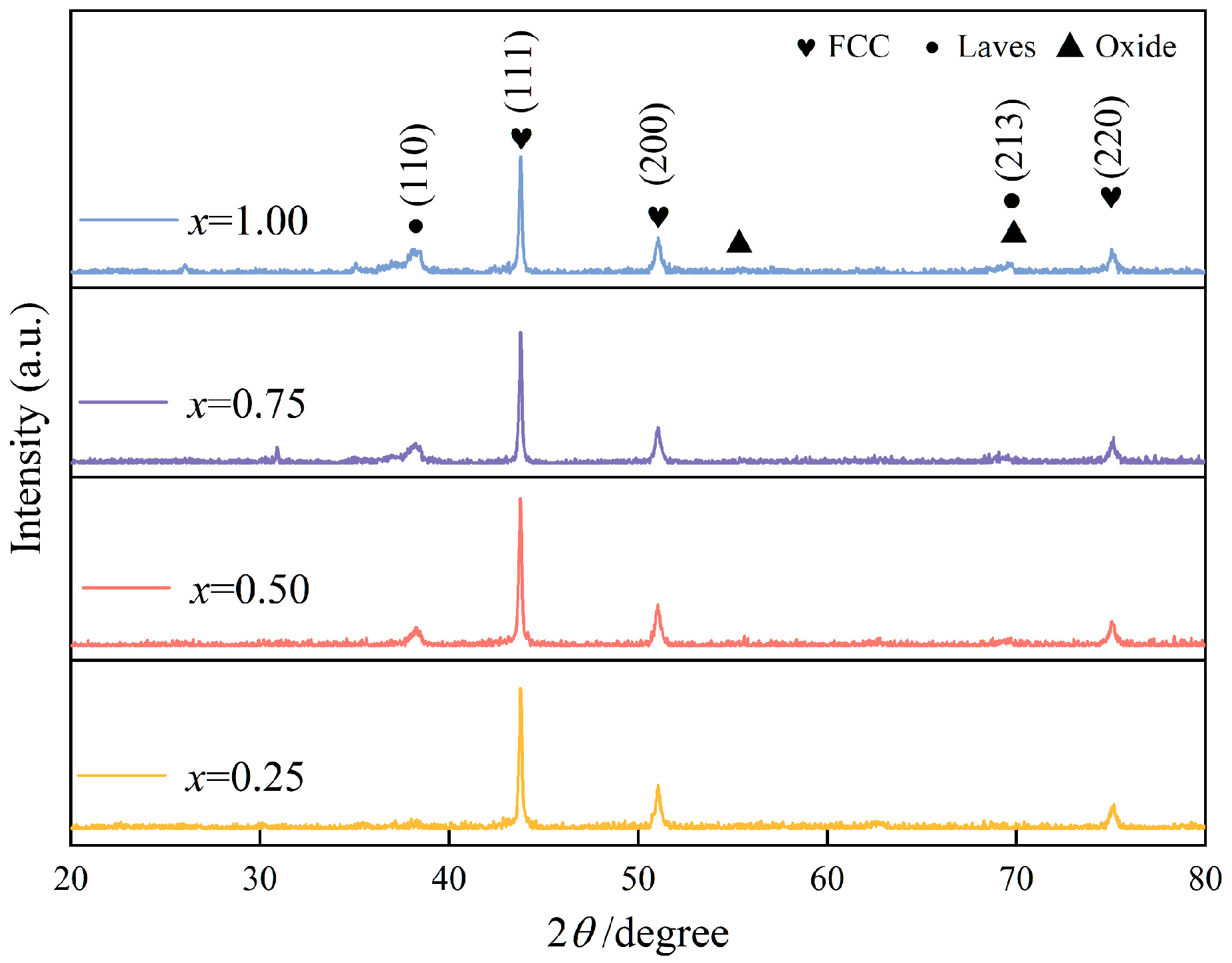 x = 0.75 and 1.00, these reflections intensify while the FCC (111) peak undergoes a modest reduction in intensity. Jade 6.5 phase matching identifies the precipitate as the Cr