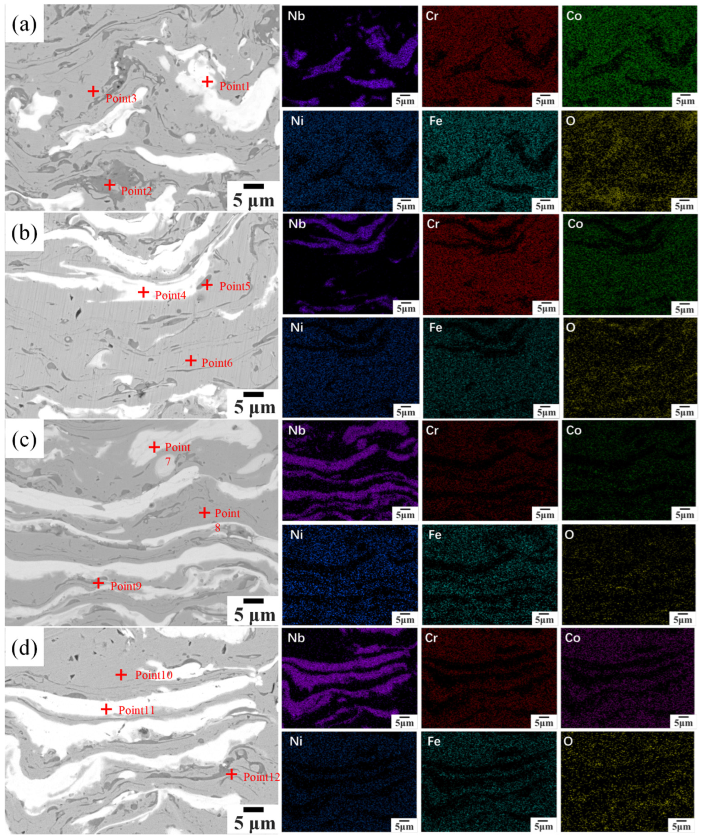 EDS elemental maps reveal that the Nb signal is concentrated in specific clusters, in clear contrast to the spatial distributions of Cr and Fe. Co, Cr, Fe, and Ni are evenly spread within the FCC matrix, while the Cr signal is locally concentrated in Laves phase areas. Oxygen distribution closely matches the Nb-active zones. As Nb content rises, the variation range of main elements in the FCC matrix broadens from ±1.5 at.% to ±3.0 at.%.