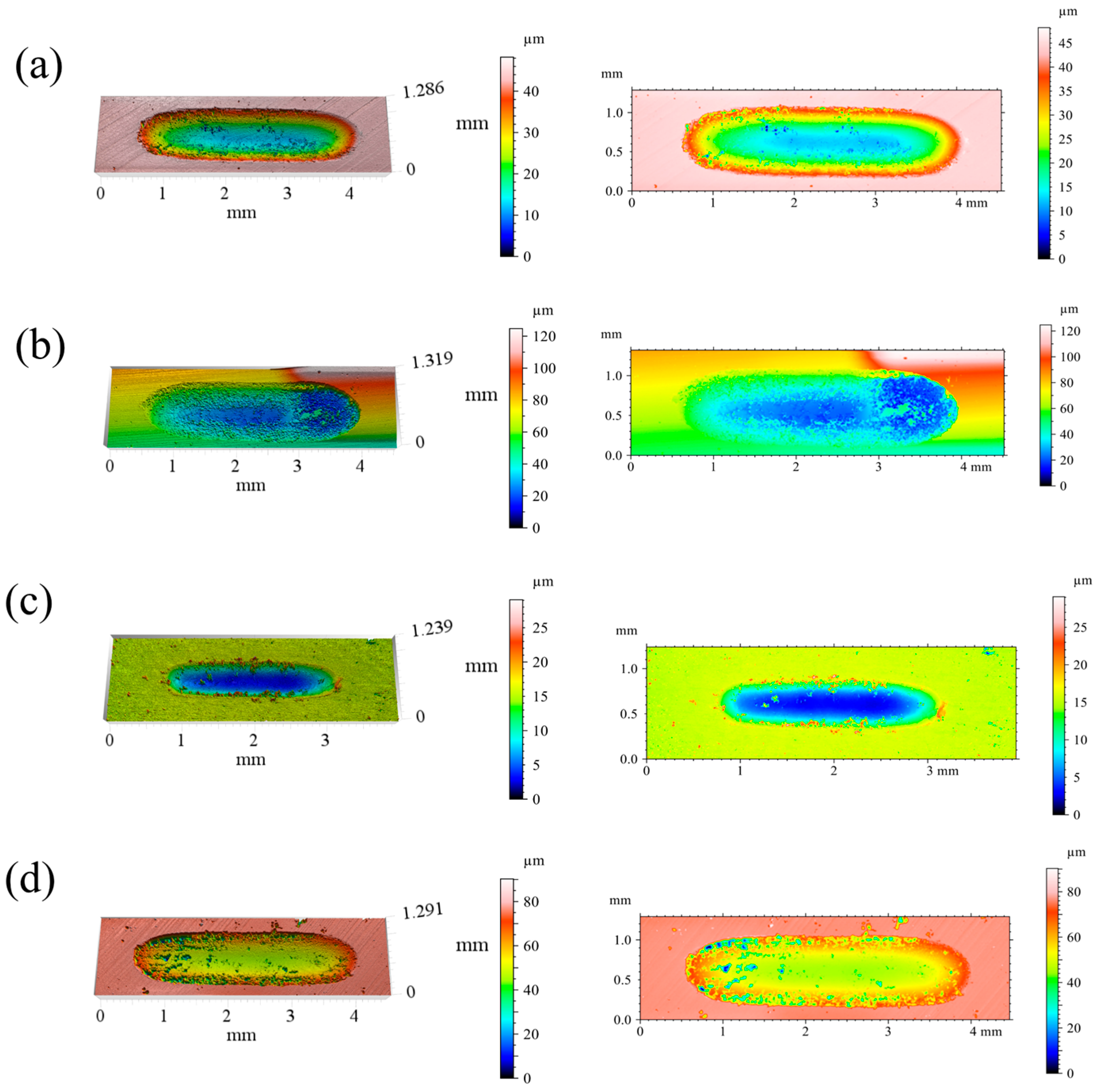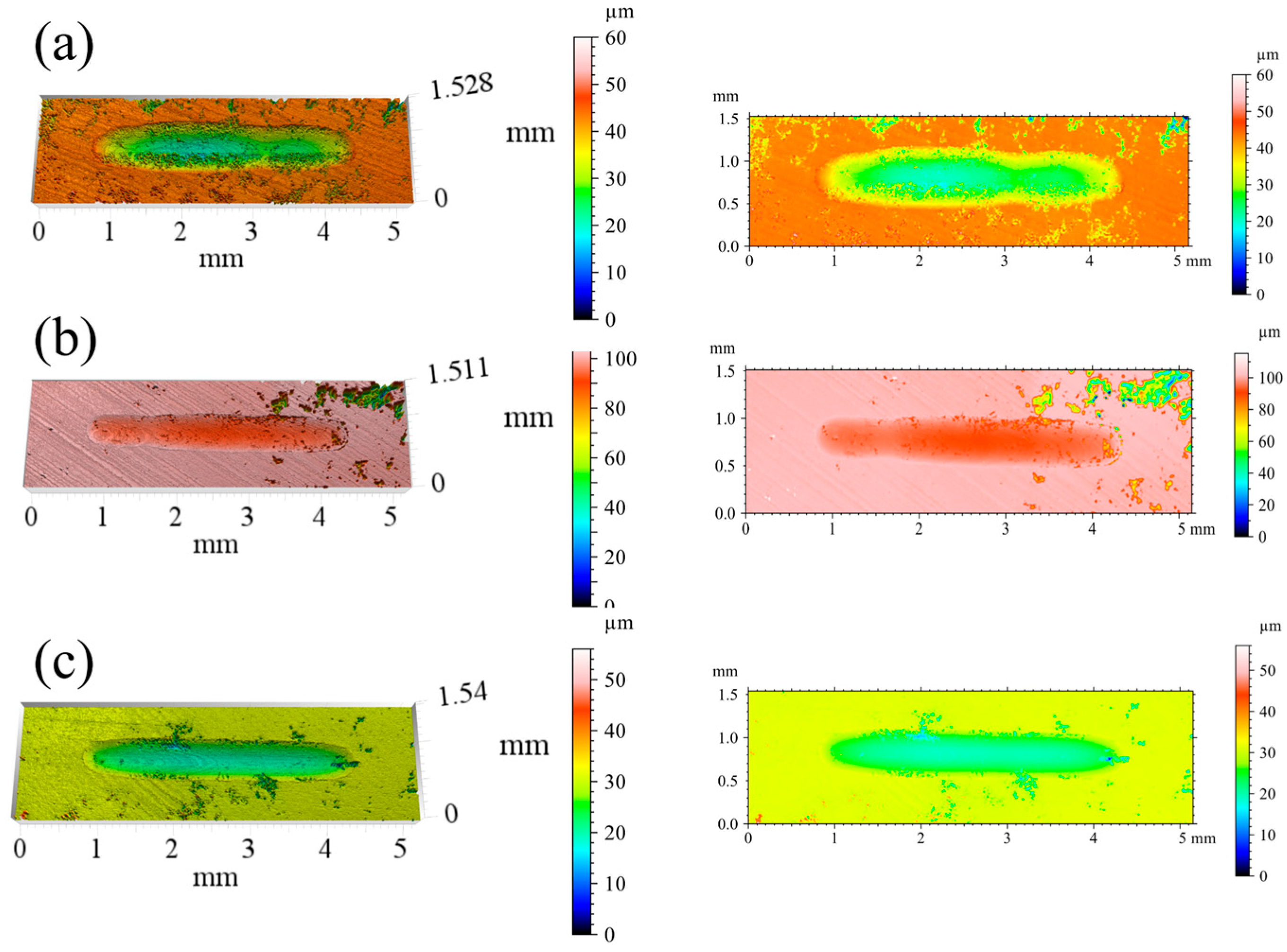 Figure 14 shows 3D white-light interferometric profiles of the worn surfaces. The HT500 coating has the shallowest depth gradient along the track edges (<5 μm·mm