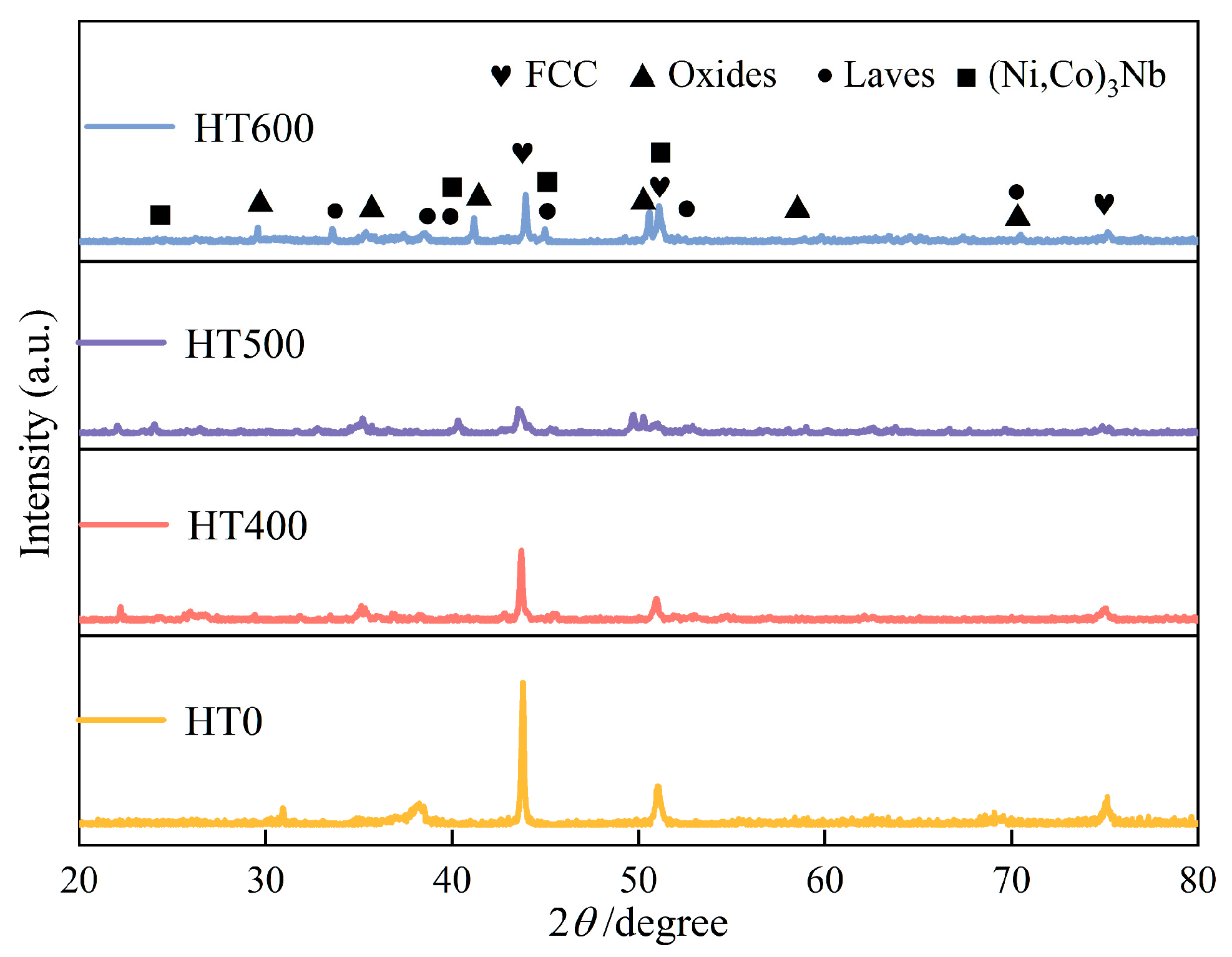 At 500 °C (HT500), within the tested temperature range of 400–600 °C, the desolubilization rate of Nb and the growth rate of the Laves phase achieve the best balance: abundant Laves phase precipitates uniformly without significant coarsening. XRD shows a clear increase in Laves phase peak intensities, and SEM reveals elongated Laves precipitates along grain boundaries with improved coating density and less microporosity. However, the characteristic composition of (Ni,Co)