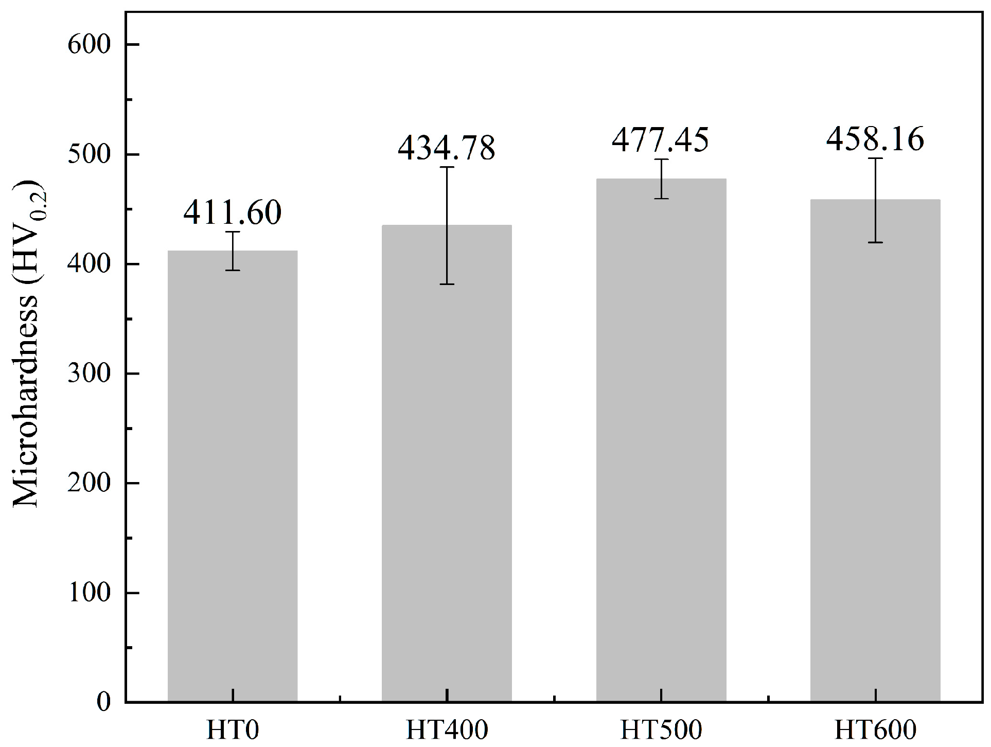 0.75 coating as a function of annealing temperature. It begins at 411.60 HV in the HT0 condition, rises to 434.78 HV at HT400, reaches a peak of 477.45 HV at HT500 (a 16% increase relative to HT0), and then slightly decreases to 458.16 HV at HT600, remaining well above the as-sprayed level.