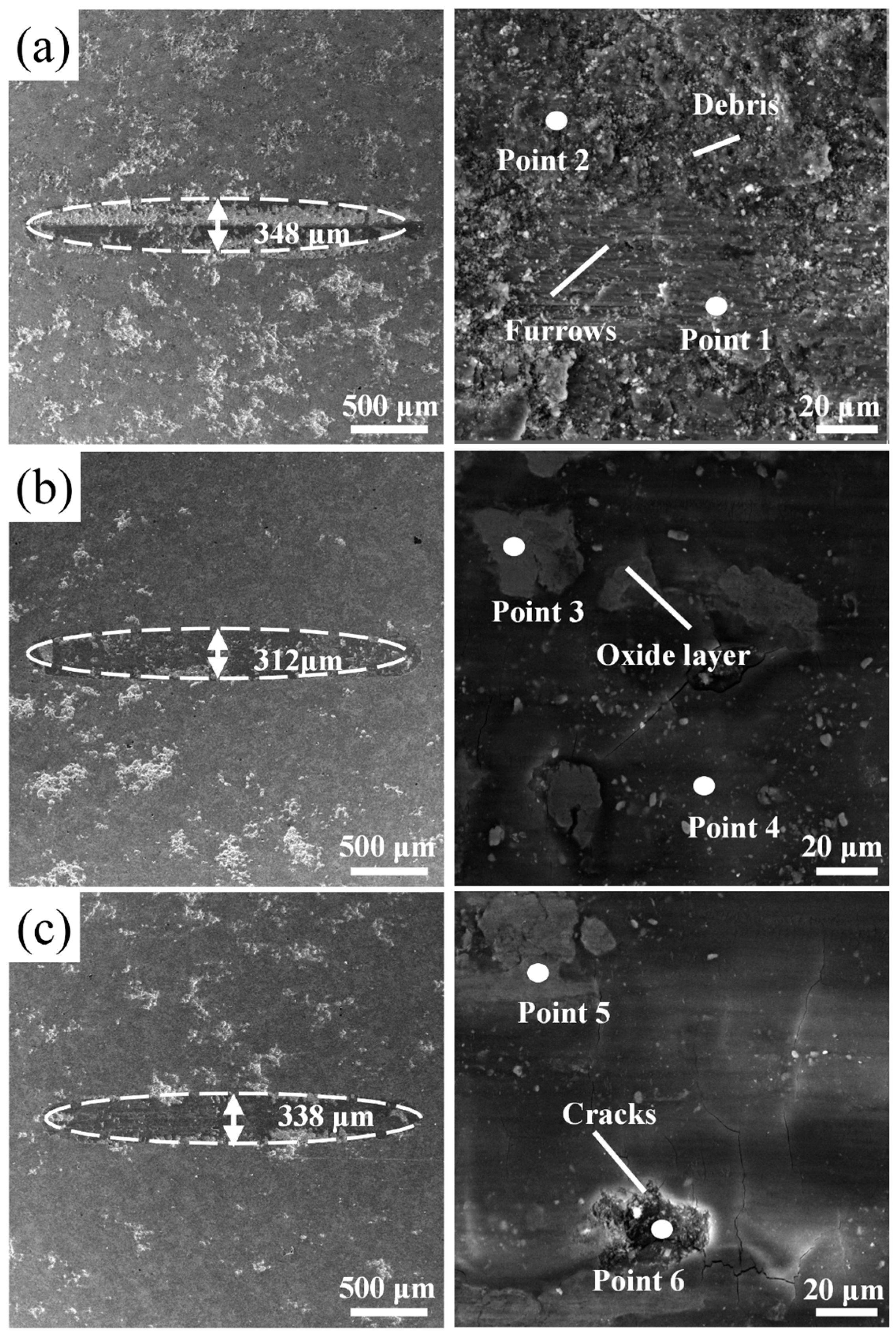 Table 6. Wear track widths rank as HT500 (312 μm) < HT600 (338 μm) < HT400 (348 μm) < HT0 (592 μm). On the HT500 surface, scattered white oxide patches mark spalled regions; EDS at Point 3 (Nb: 50.4 at.%) confirms these as Laves phase oxidation zones, whereas the neighboring intact area (Point 4) carries considerably less oxygen (44.2 at.%), suggesting oxidation remained localized. HT400 exhibits mixed abrasive–adhesive damage: groove zones register O at 32.5 at.% (Point 1), and debris accumulation zones reach 64.1 at.% (Point 2), consistent with secondary oxidation of detached wear particles. HT600 develops pits of roughly 15–20 μm diameter; fine cracks run along grain boundaries at the pit edges, and O content within these cracks reaches 53.6 at.% (Point 6), pointing to pronounced grain boundary oxidation.