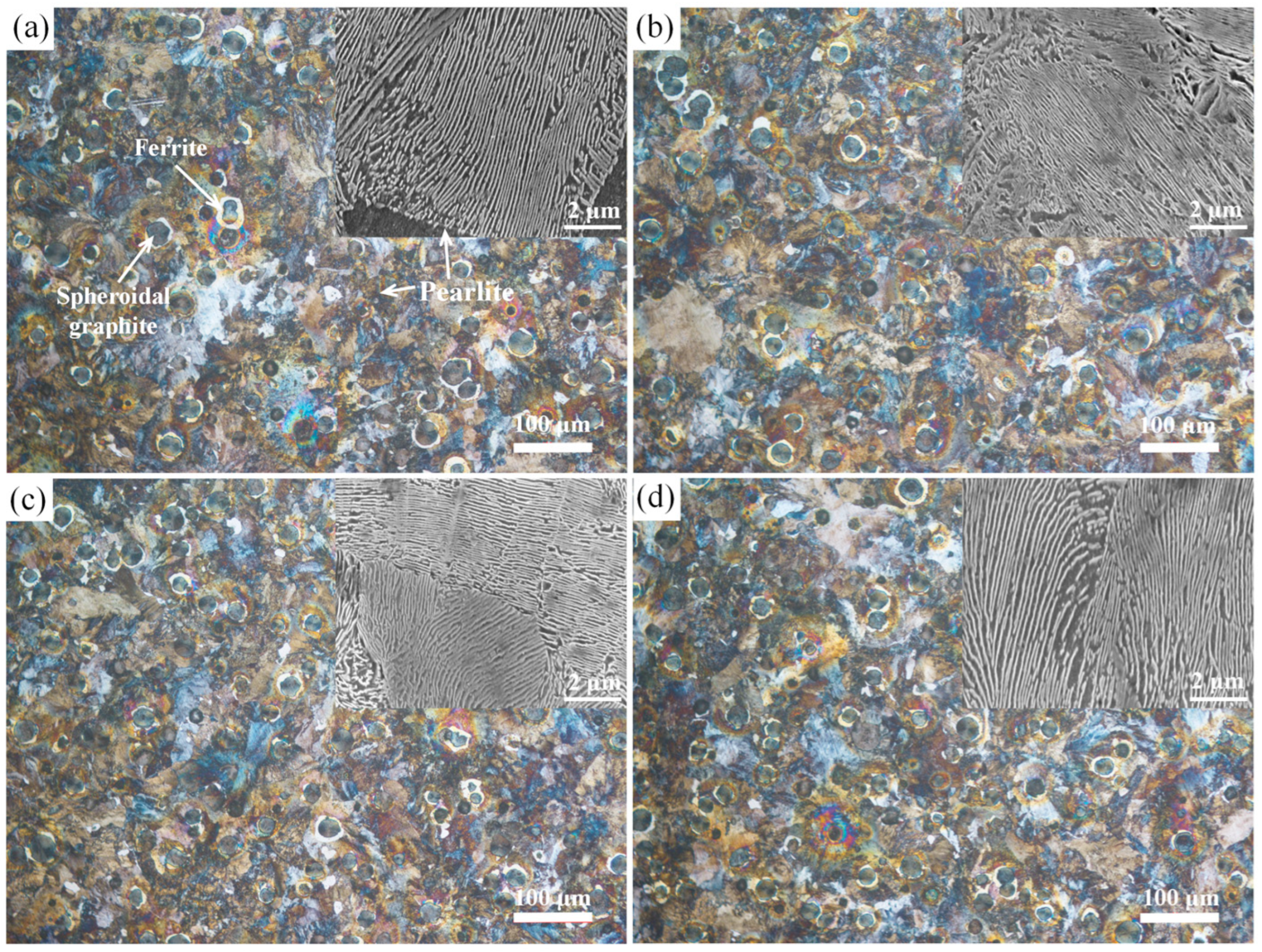 (4) No obvious microstructural deterioration was observed in the QT800-5 substrate after low-temperature annealing, demonstrating the good process compatibility of the current heat treatment route for ductile iron substrates.