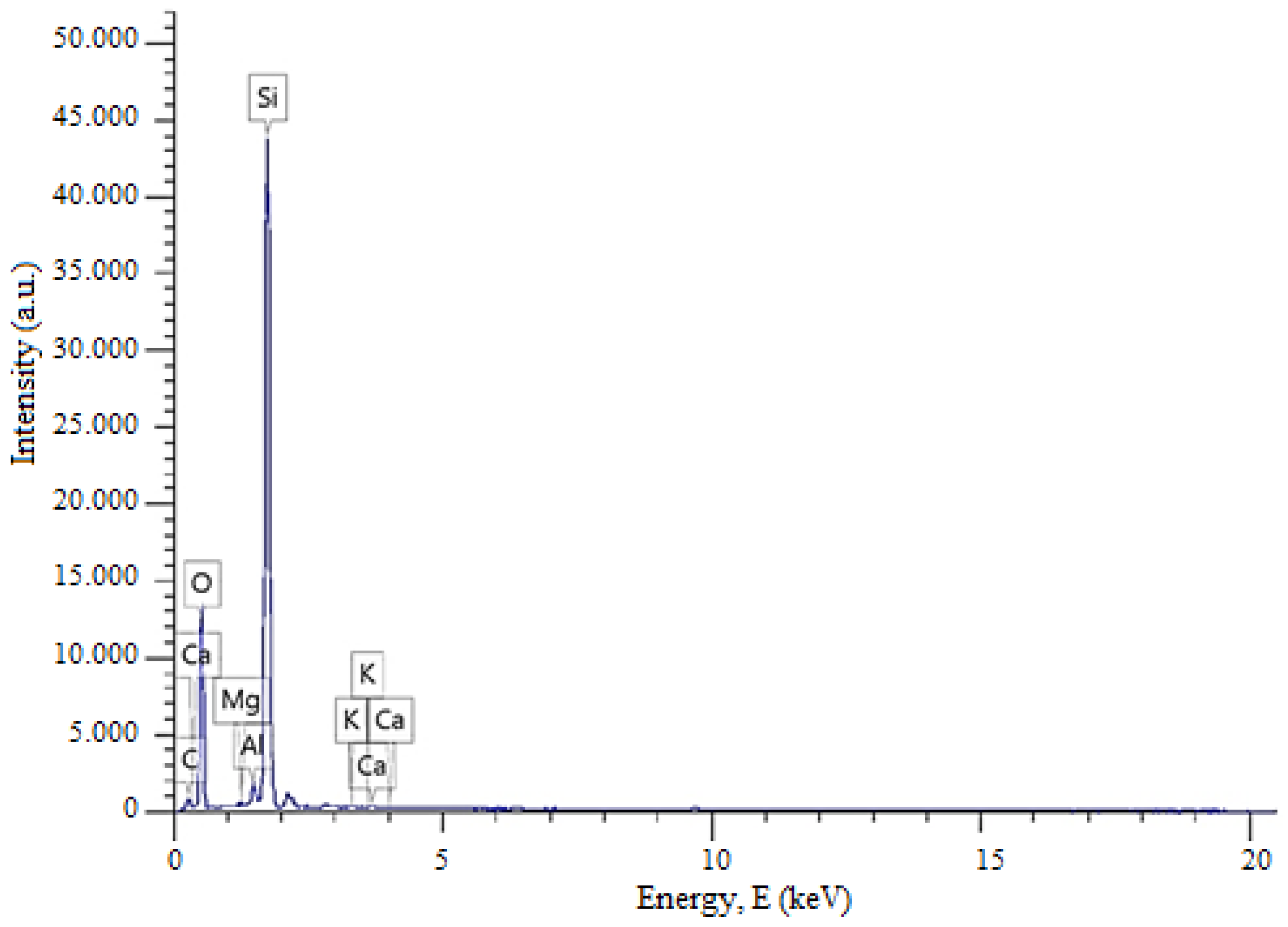 The XRD and EDS analyses indicate that the studied quartz sand sample predominantly consists of silicon and oxygen, uniformly distributed throughout the structure. Minor elements such as Mg, Al, K, and Ca are present in trace amounts, likely due to localized inclusions of clay minerals or aluminosilicates. This reflects the high purity and structural homogeneity of the material. The relatively high carbon content detected by EDS (