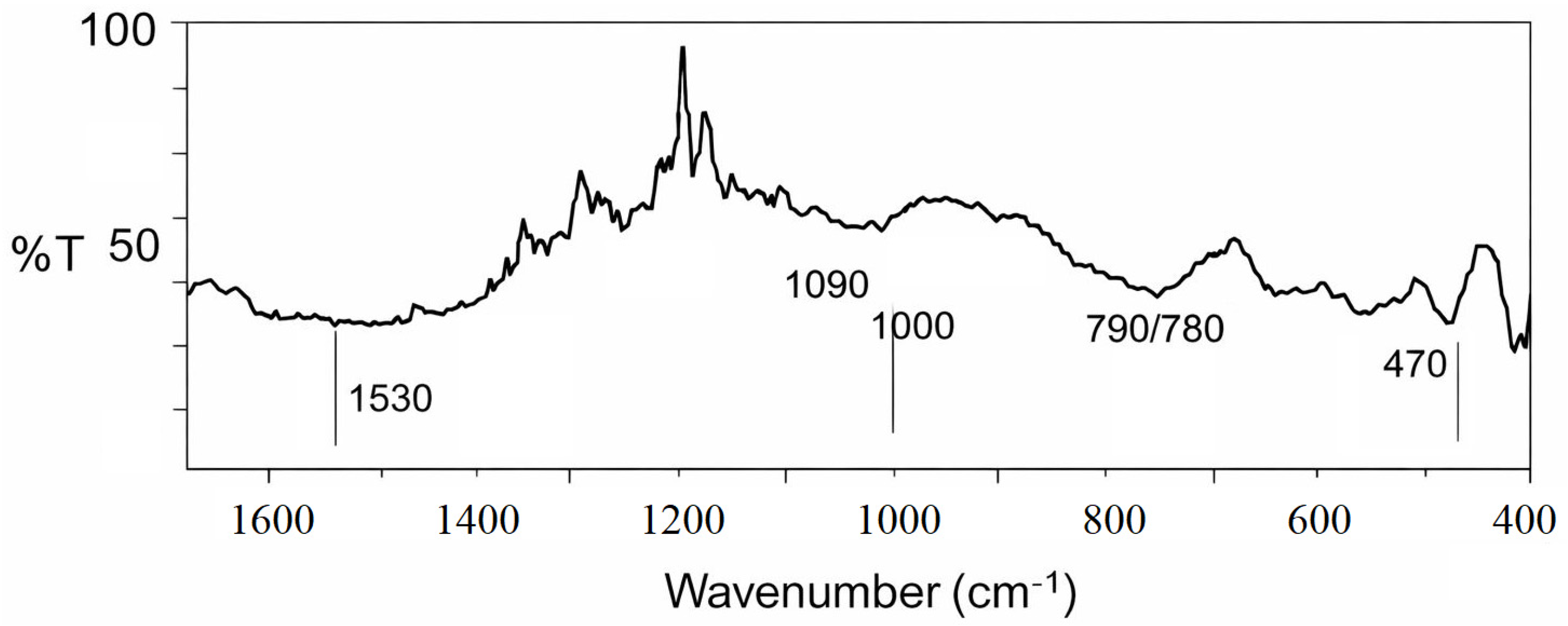The most intense absorption band observed at approximately 1080–1100 cm−1 is attributed to the asymmetric stretching vibrations of Si–O–Si bonds, which is characteristic of silica. Additional bands located at around 790–800 cm−1 and 460–470 cm−1 correspond to the symmetric stretching and bending vibrations of Si–O–Si bonds, respectively. These bands are typical of crystalline silicon dioxide (quartz phase), indicating the presence of a crystalline component in the sample.