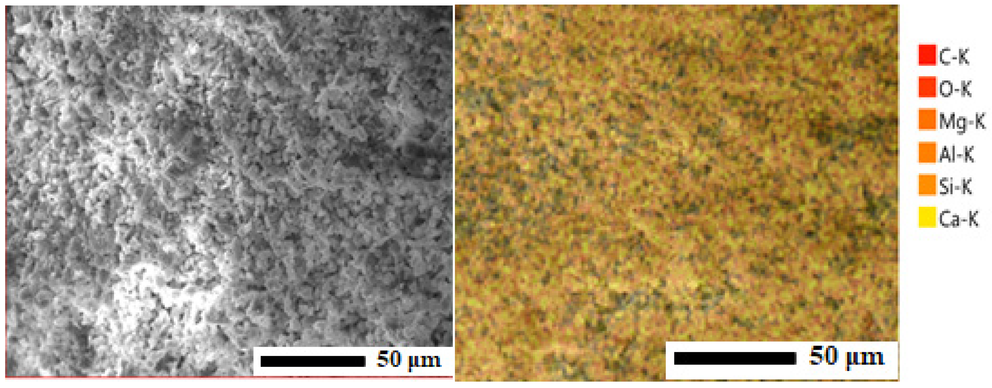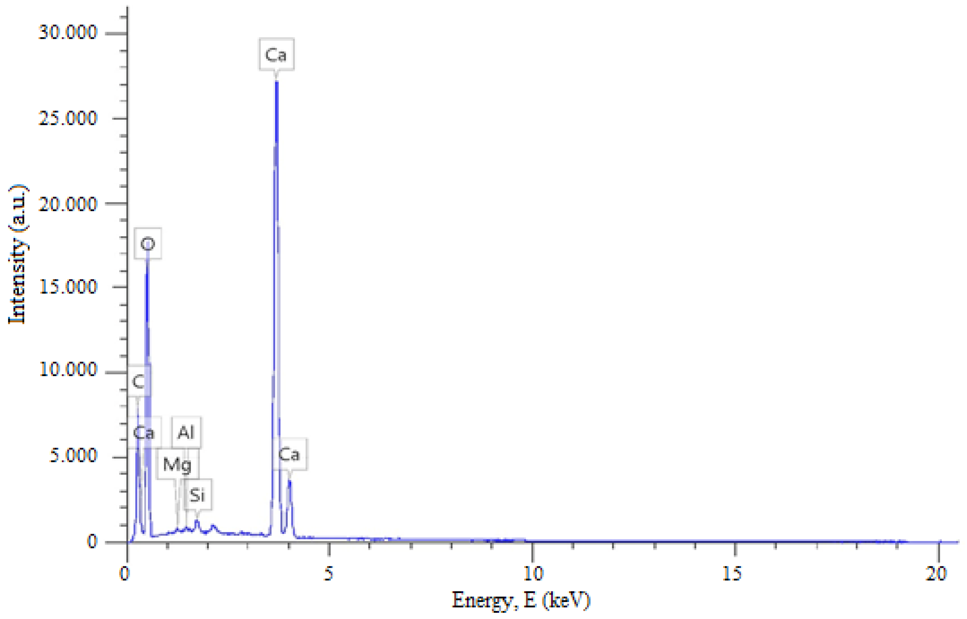 Therefore, the carbon detected by EDS analysis is unlikely to originate from carbonate phases. Instead, it is attributed to loss on ignition (LOI), including surface contamination, residual organic matter (e.g., humic substances), and possible carbon coating applied during SEM–EDS analysis. Accordingly, carbon is not considered a structural component of the material.