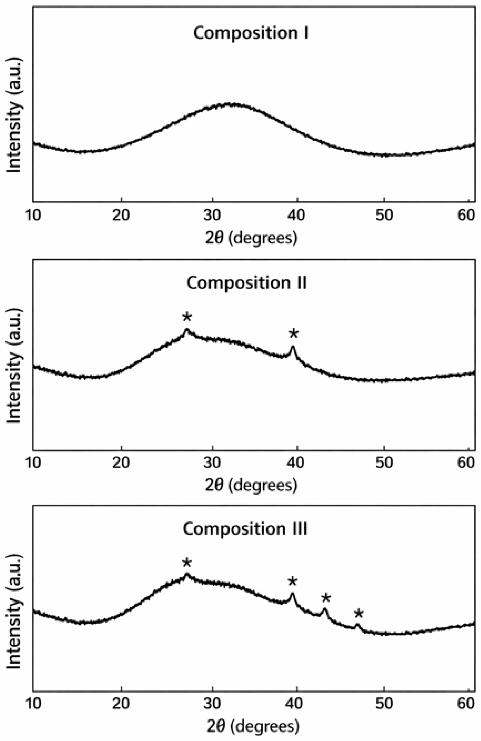In Composition II, a weak diffraction peak at approximately 2θ ≈ 26.6° is attributed to cristobalite (SiO2) (ICDD PDF No. 00-082-0512). An additional feature near 2θ ≈ 39–40° may correspond to wollastonite (CaSiO3) (ICDD PDF No. 00-043-1460), formed through the interaction between SiO2 and CaO during melting. The low intensity of these peaks indicates that these crystalline phases are present only in minor quantities.