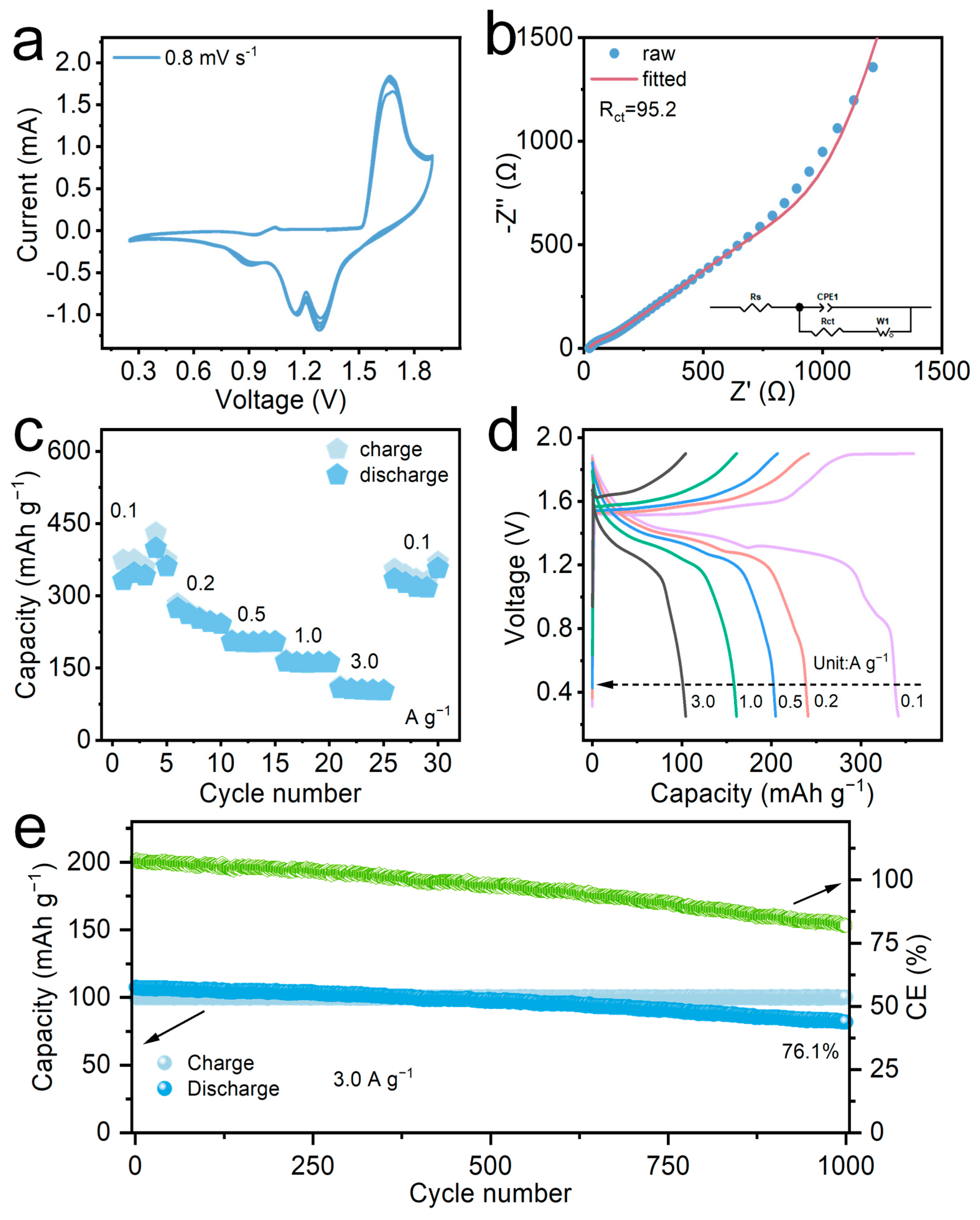 - The material possesses excellent cycling stability (76.1% retention after 1000 cycles at 3 A g−1).