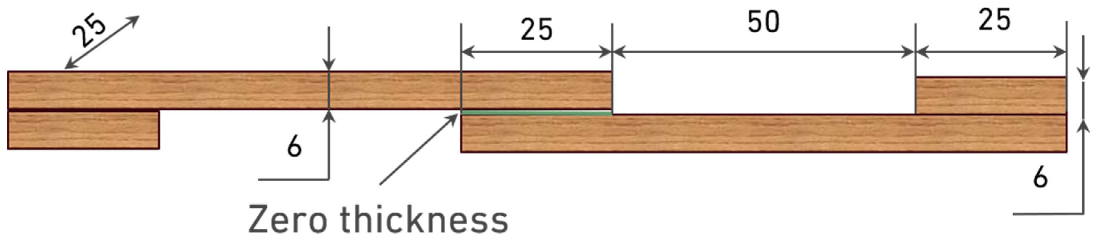 Reference configuration: The first configuration, referred to as the reference joint, was fabricated using either pine or oak substrates with a uniform thickness of 6 mm. The geometry of this configuration is presented in