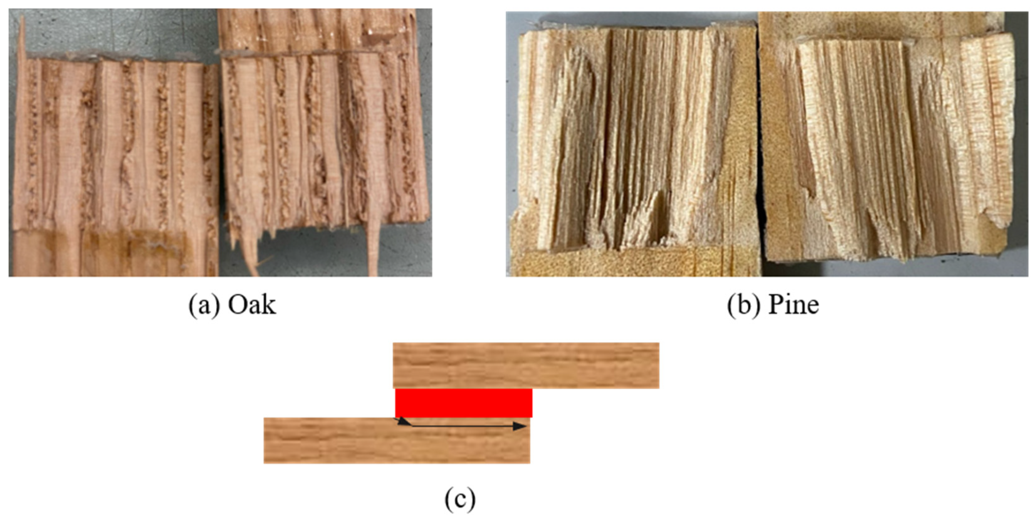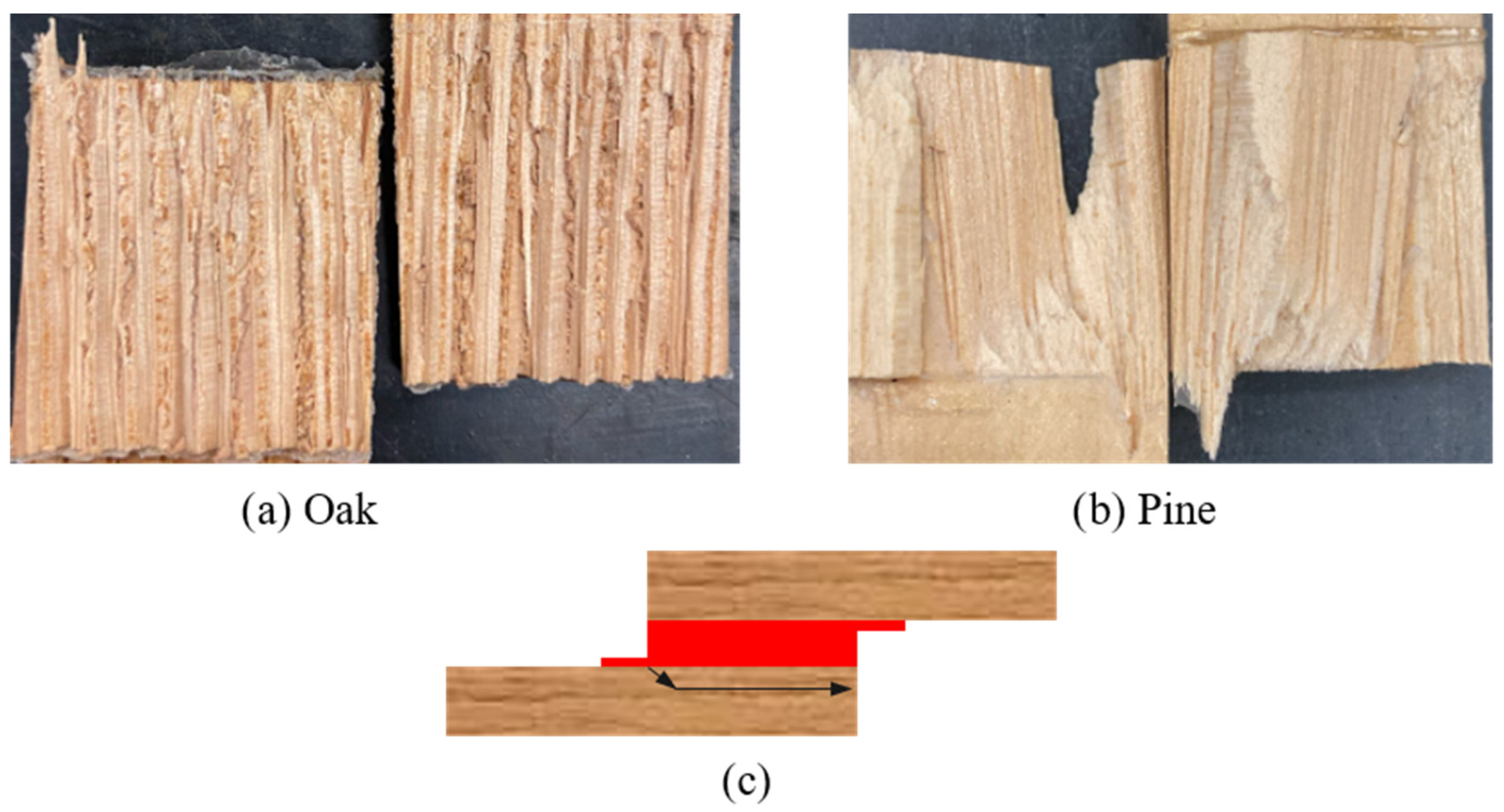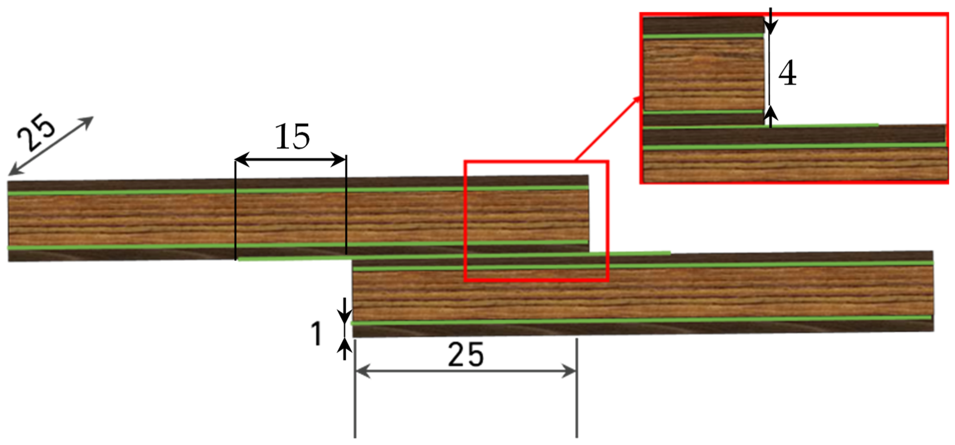 Figure 2). This design aimed to take advantage of adhesive penetration into the porous wood structure. Such penetration increases the effective bonding area and locally reinforces the wood cell walls, which improves transverse strength in the overlap region. As a result, stress concentrations at the overlap ends can be reduced, delaying crack initiation, limiting propagation along the bondline and ultimately enhancing the joint’s capacity for energy absorption and toughness.
