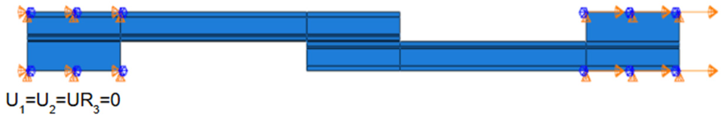 Figure 4. At one extremity, an encastre was applied to replicate the gripping system. For the opposite end of the SLJ, in the case of quasi-static loading (tensile testing), a displacement of 1 mm was imposed, and for impact conditions, a mass (drop-weight) equivalent to the experimental impactor was modelled and assigned the same initial velocity of 3 m/s. This velocity field was defined in the initial step and propagated throughout the subsequent analysis.
