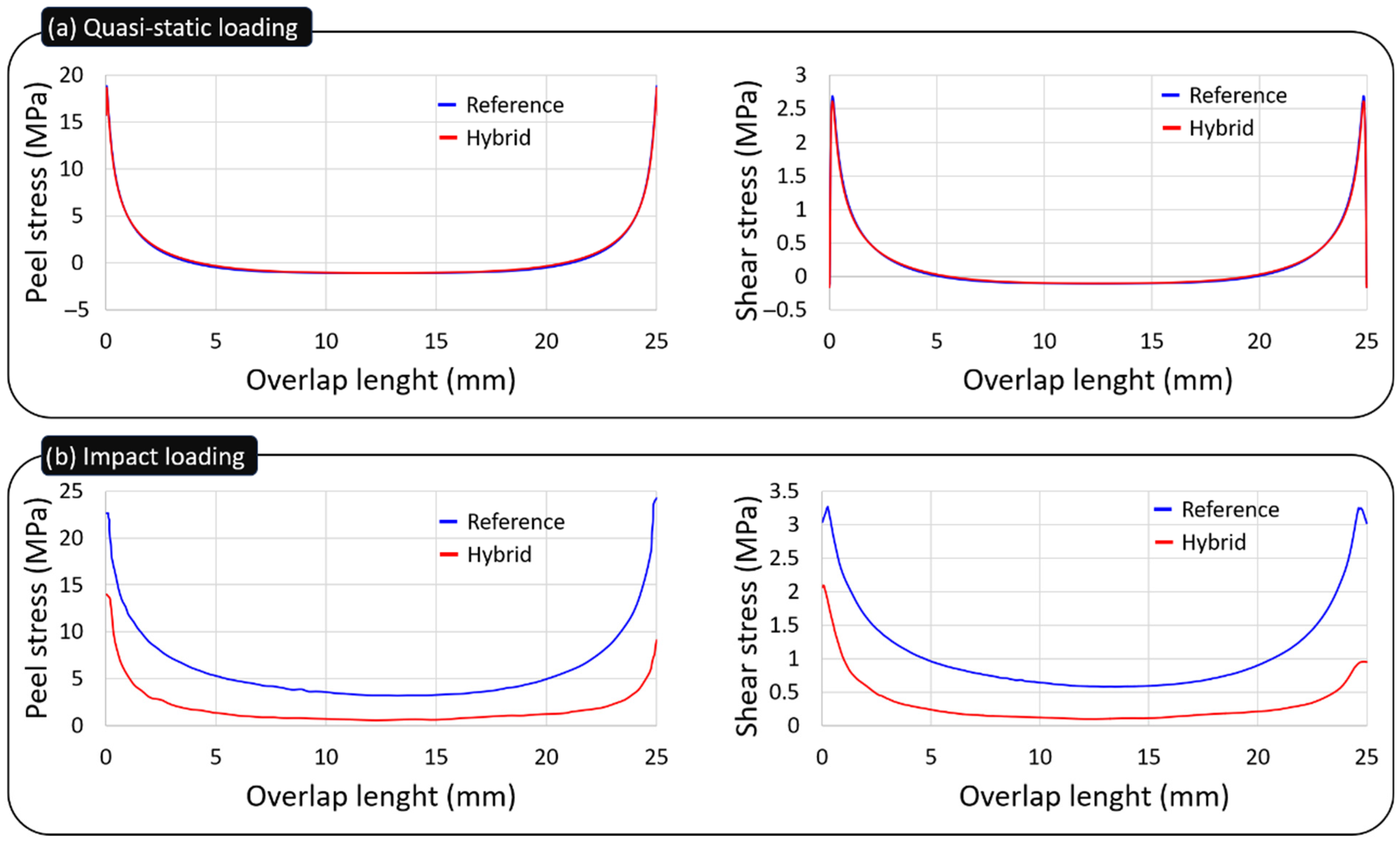 Figure 5b demonstrates, the hybrid configurations show much lower peak peel stresses when compared with the reference configuration. The maximum peel stress obtained with the hybrid joint simulation was 13.95 MPa, and for the reference simulation it was 22.60 Mpa, showing a 38.27% decrease.
