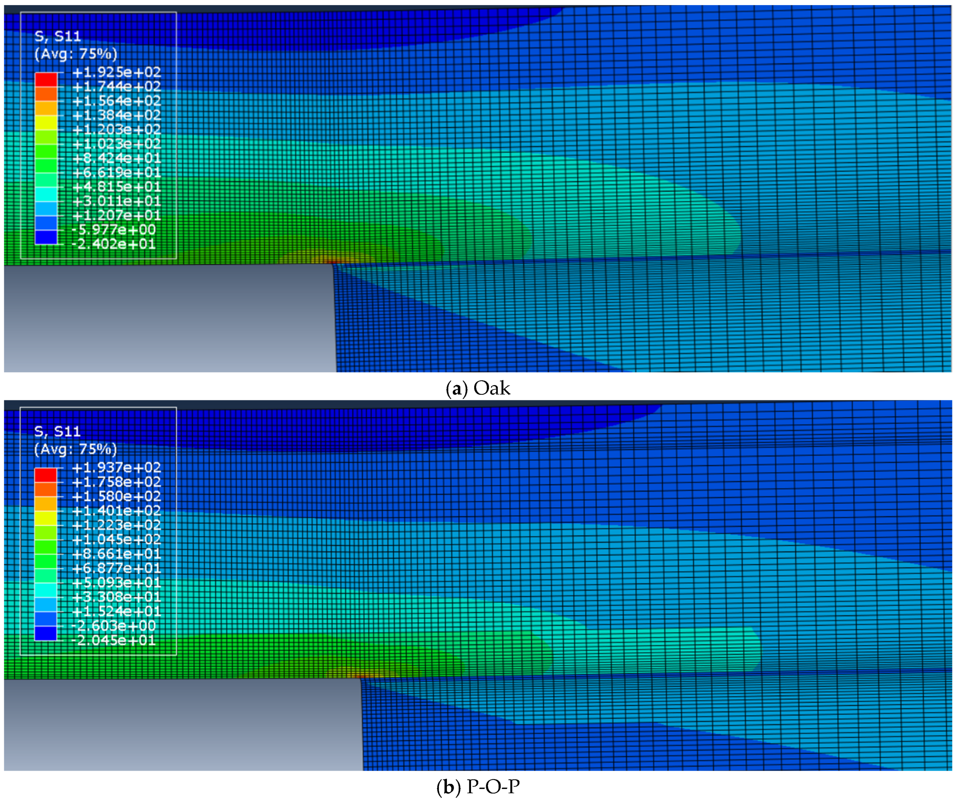 Figure 6 shows a comparison of the tensile stress distribution, at quasi-static test conditions, between the reference (oak: at the top) and the hybrid (P-O-P: at the bottom) and configurations under numerical study.