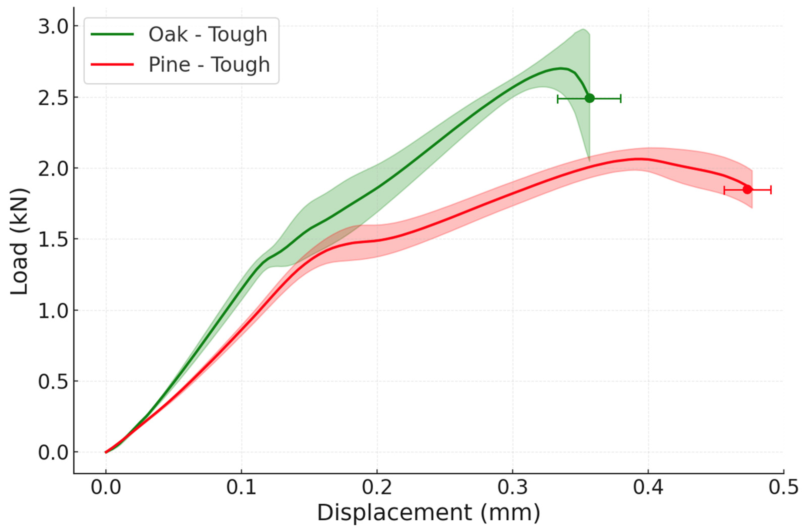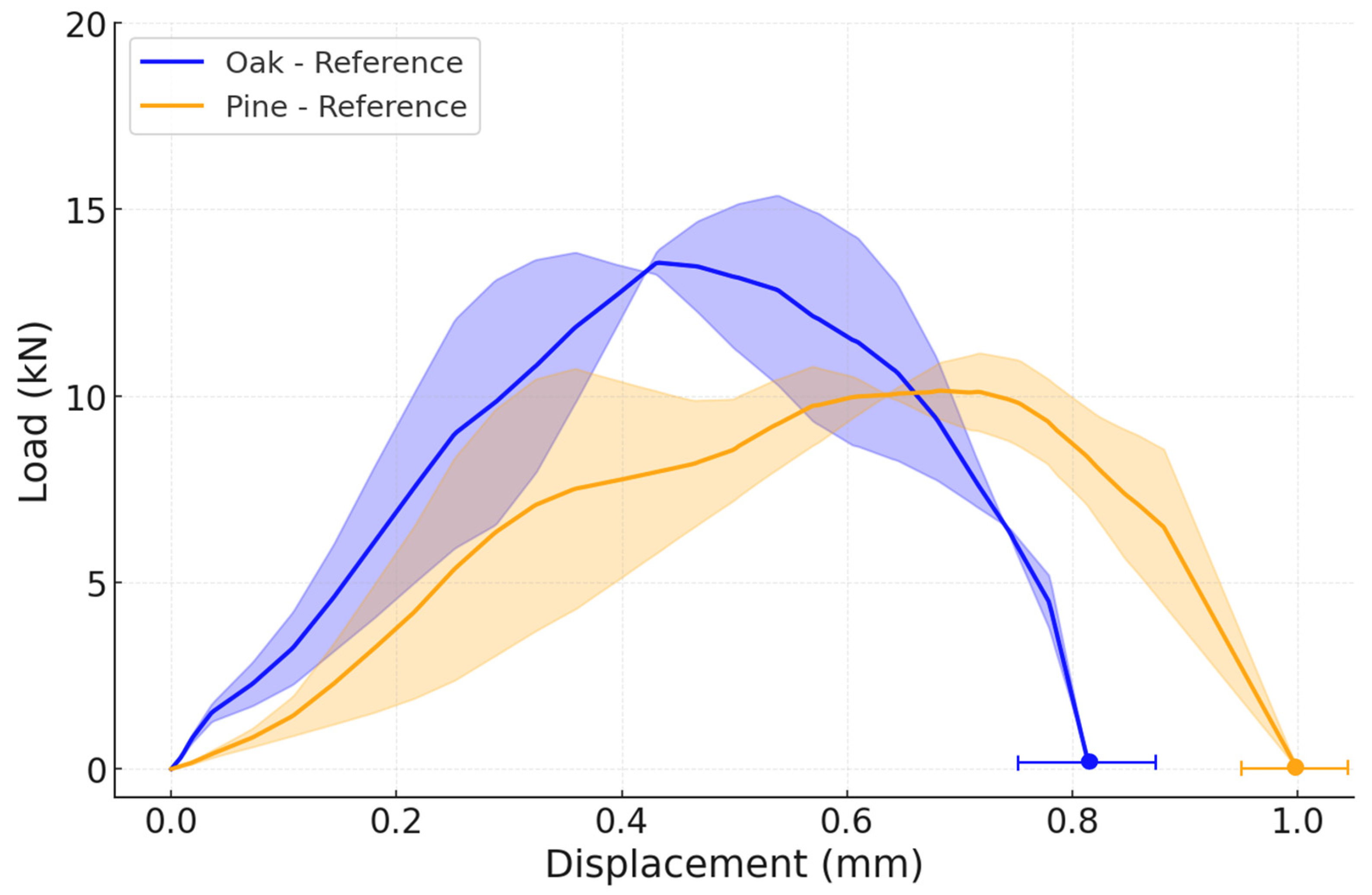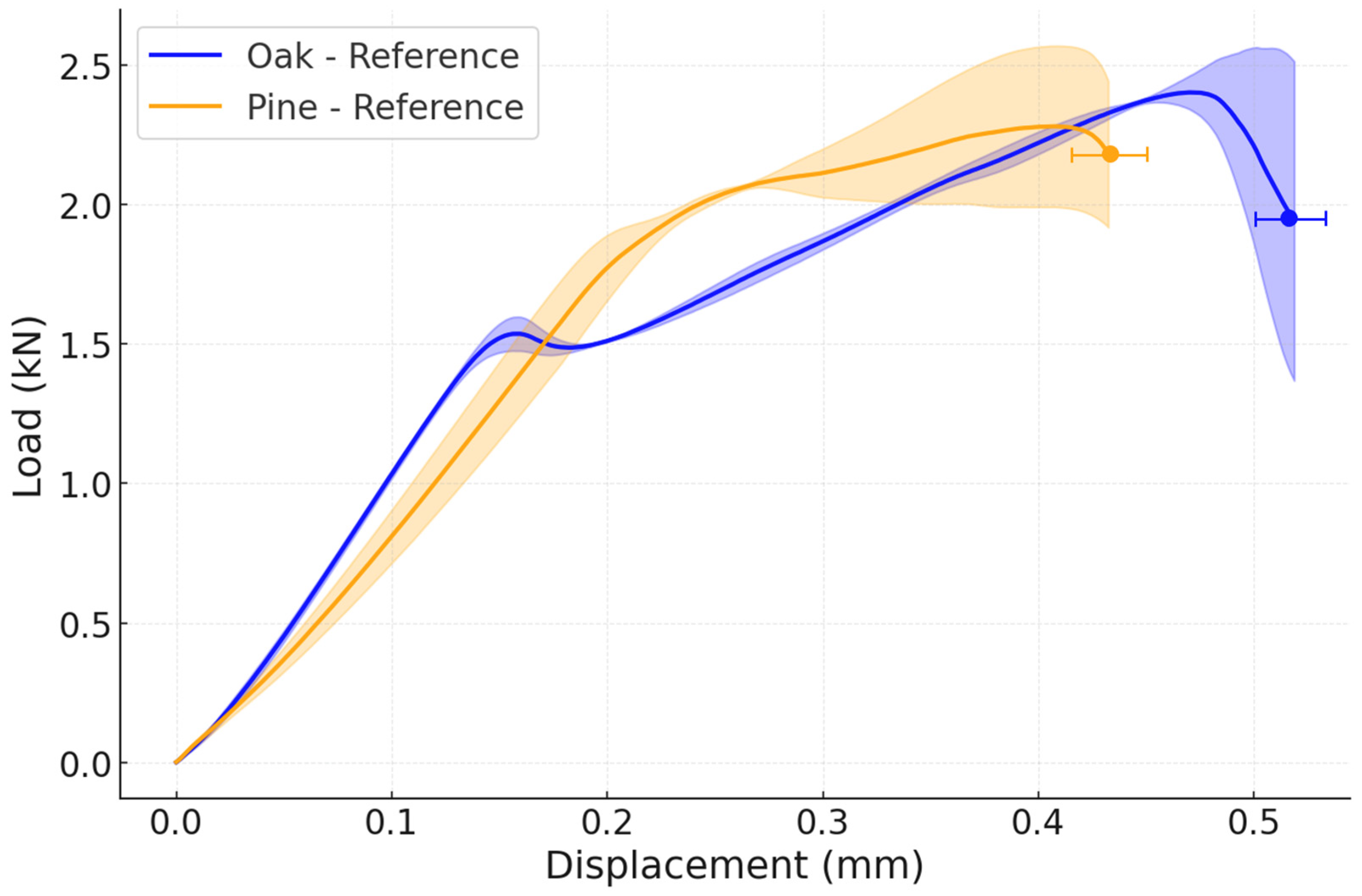 Figure 9. The failure load of both reference joints is very similar, as well as their displacement, since the stiffnesses of both woods are also comparable. Specifically, the average failure load of a reference oak joint is 2.41 ± 0.07 kN, while the average failure load of the reference pine joint is 2.28 ± 0.31 kN.