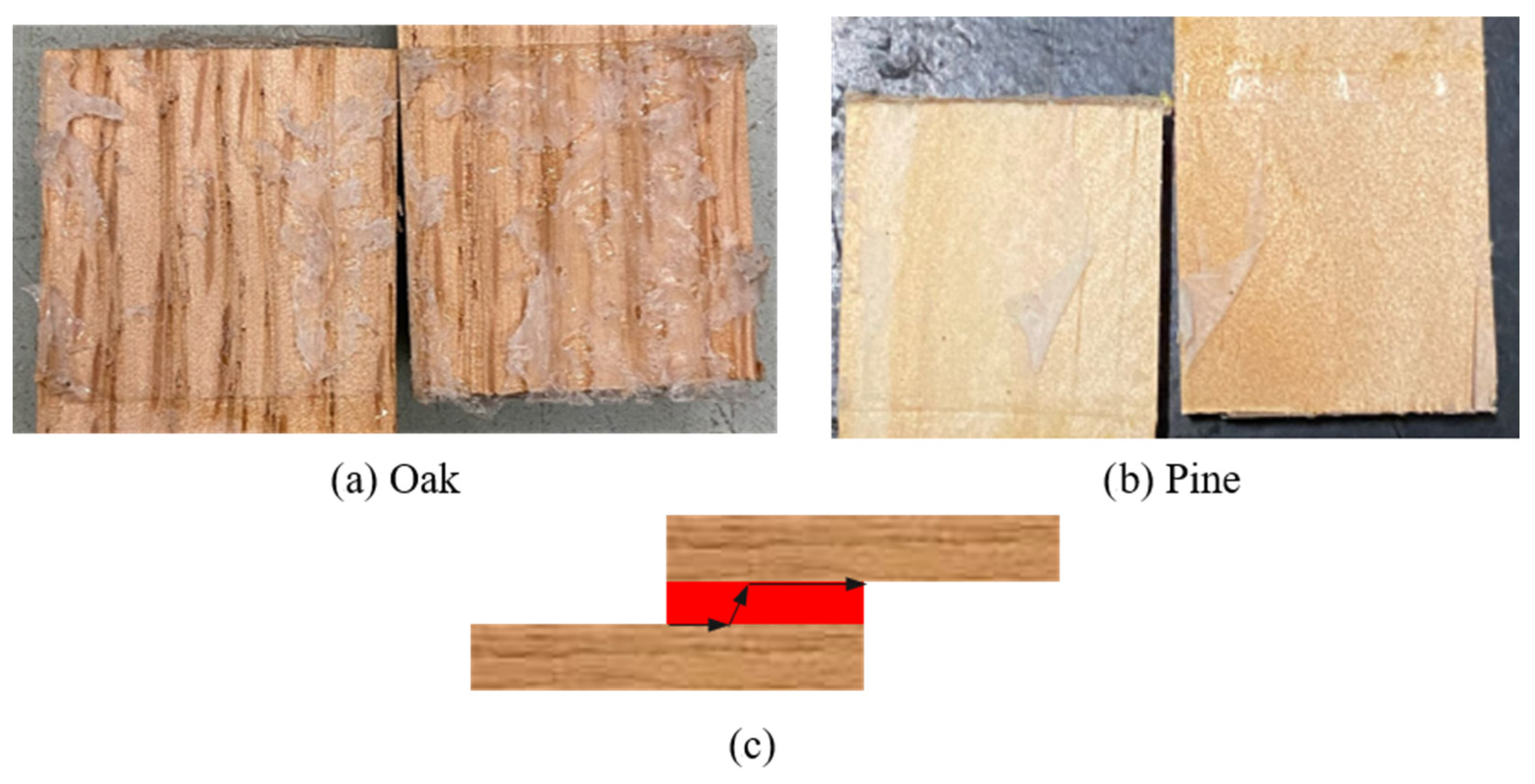 Hybrid configuration: The third configuration combined pine and oak within the same adherend, producing hybrid specimens (